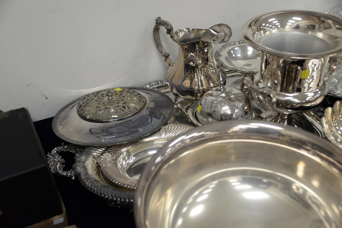Large lot of silverplate including punch set, pitcher, wine cooler, lazy Susan, bowls, tray, and more.