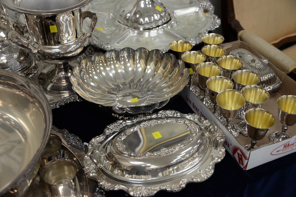 Lot 400: Large lot of silverplate including punch set, pitcher, wine cooler, lazy Susan, bowls, tray, and more.