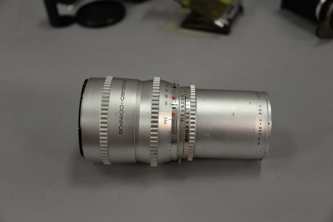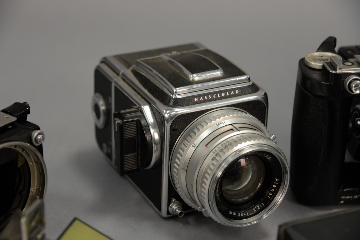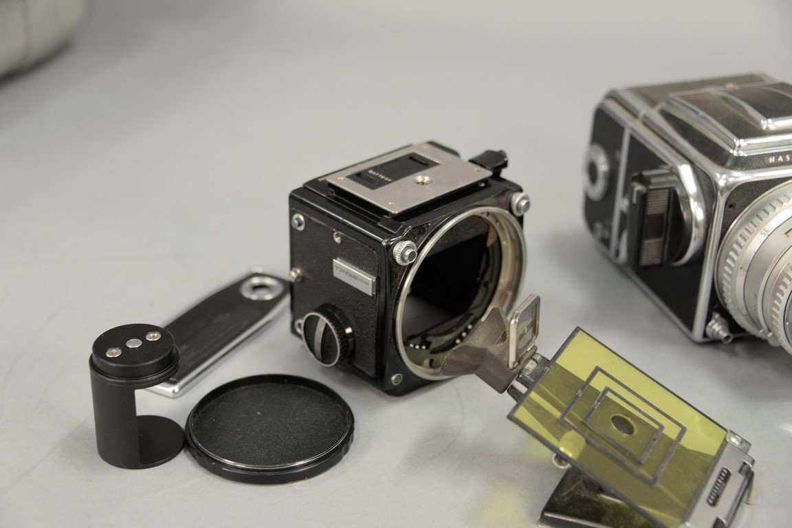 Lot 400: One box lot: Camera lot to include Hasselblad 500c with back and planar 80/2.8, Hasselblad 500EL battery cover lock, 2 hoods, spor…