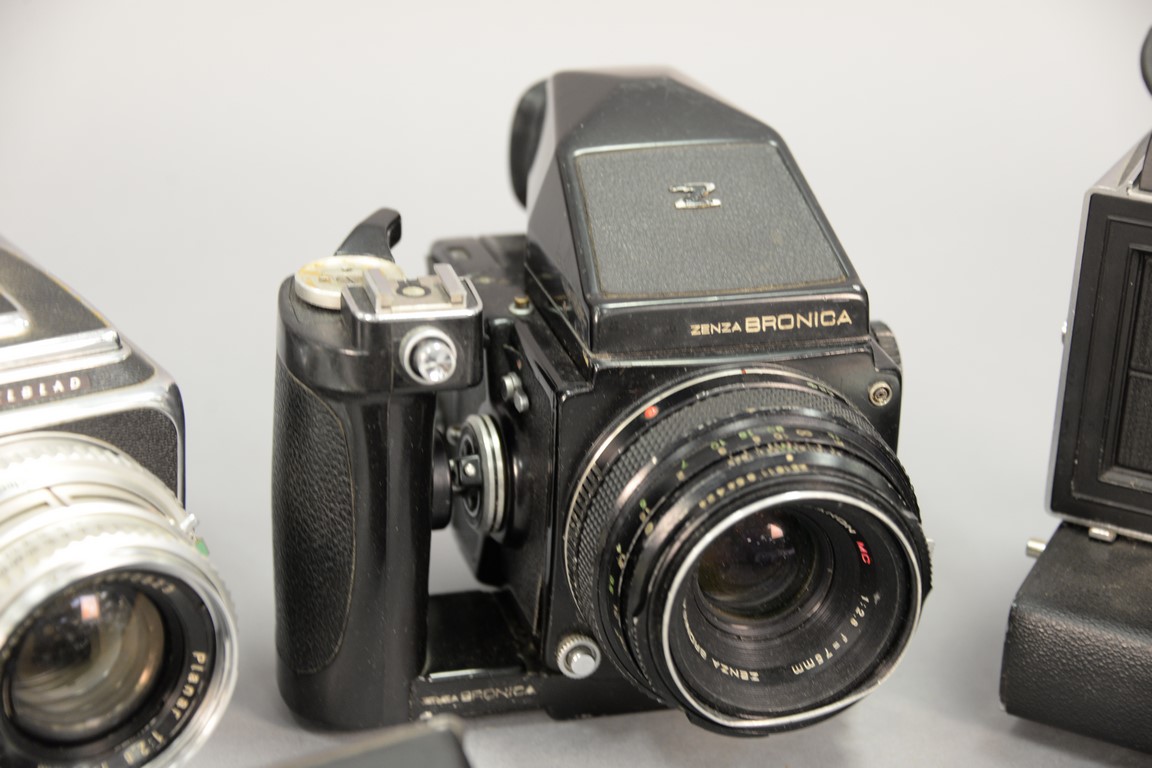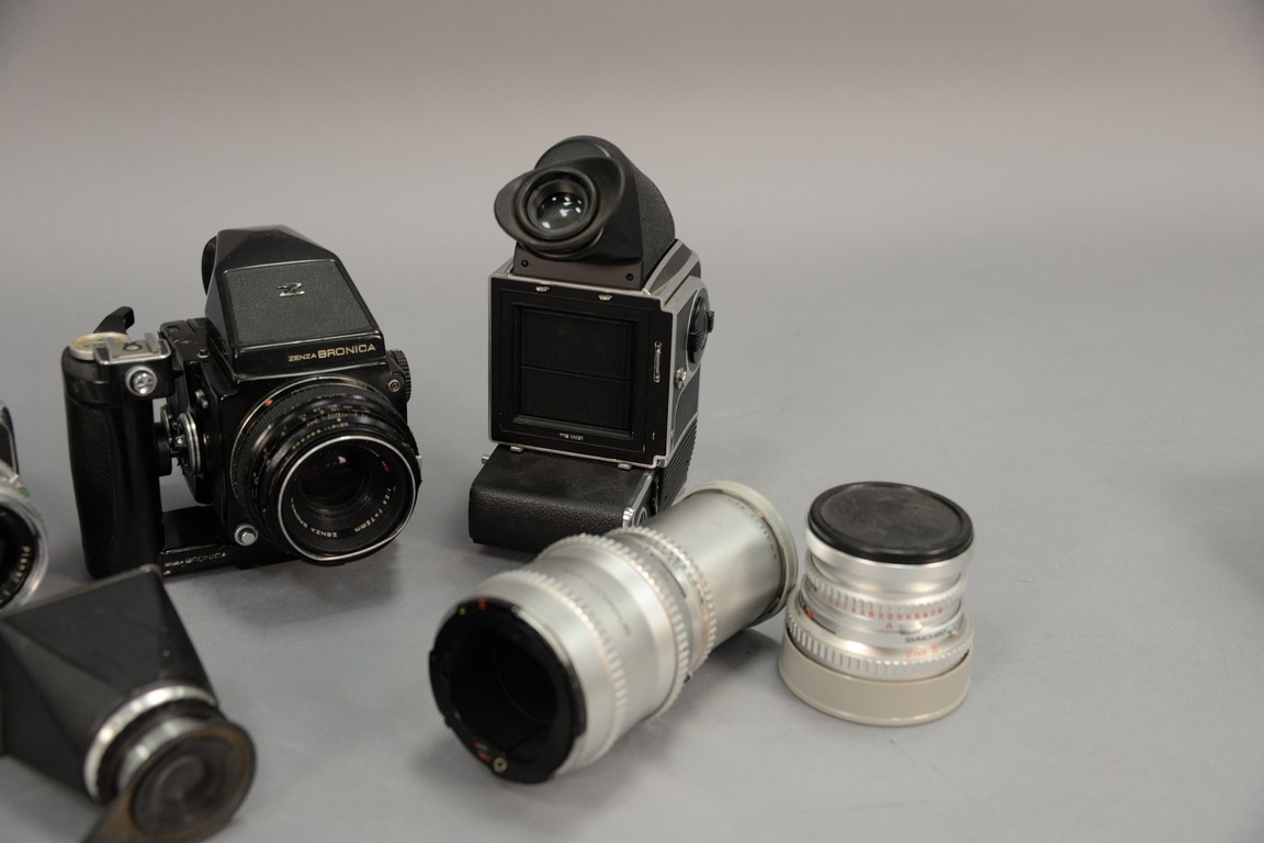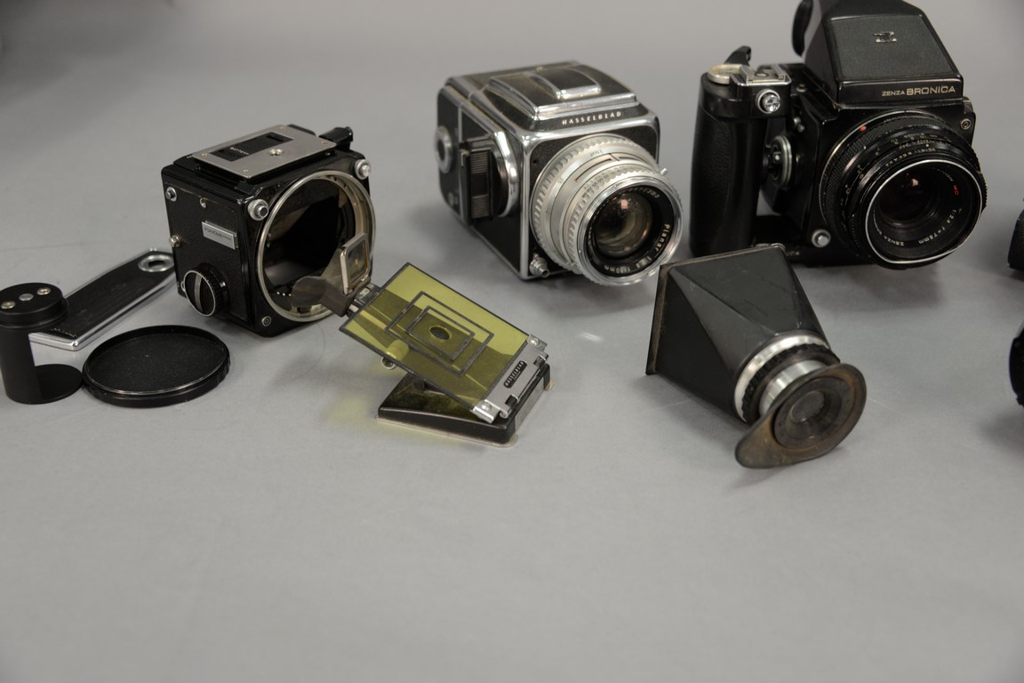 One box lot: Camera lot to include Hasselblad 500c with back and planar 80/2.8, Hasselblad 500EL battery cover lock, 2 hoods, sport finder, Sonnar 250/5.6, Distagon 60/5.6, and Bronica ETRC with back, grip, zenzanon 75/2.8 and ETR body eye level hood.