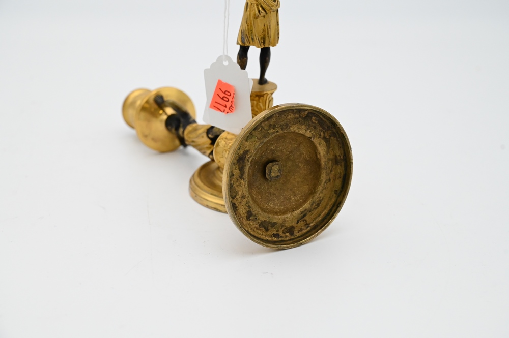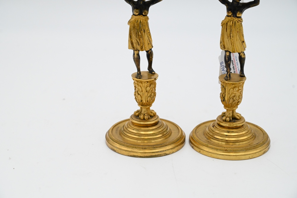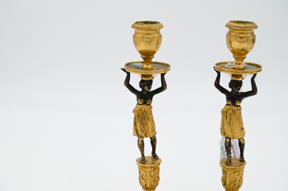 Lot 400: Pair of French Bronze Figural Candlesticks, each having nude female shaft, standing on a pedestal with claw feet on circular base, height 8 1/4 inches.