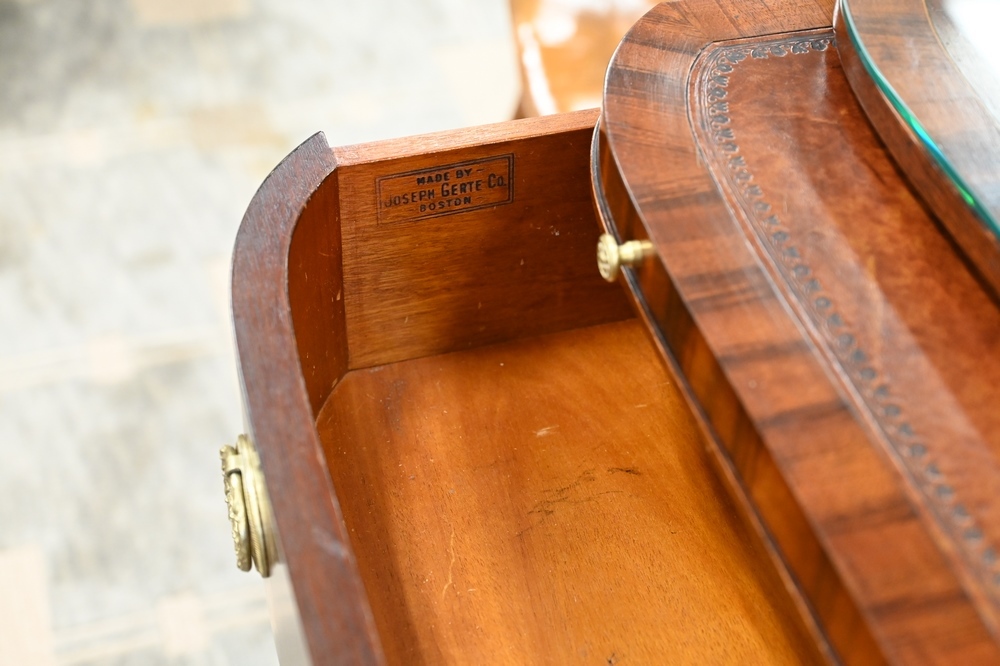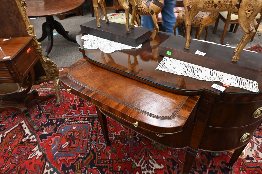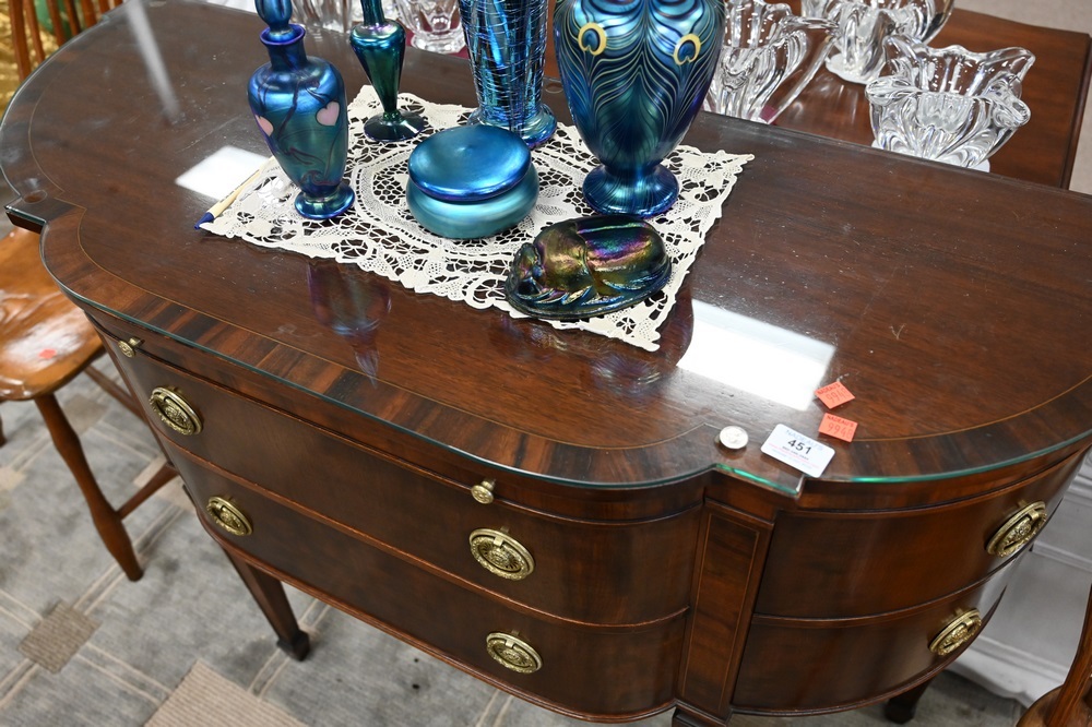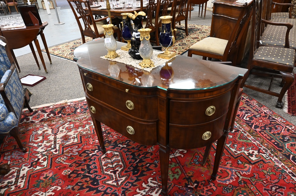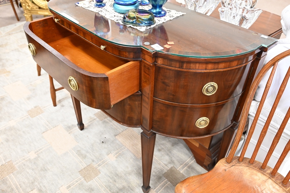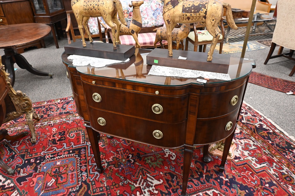 Lot 400: Pair of Gerte Custom Mahogany Servers, having banded inlaid shaped tops, with two drawers flanked by bow end doors and fitted glass tops, top having light imperfections under glass, height 34 inches, width 45 inches, top 18″ x 45″.