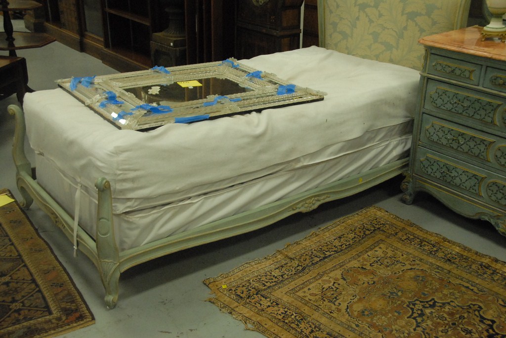 Lot 400: Pair of Louis XV style twin beds, each with upholstery inserted headboards surrounded by light blue green frame with matching carved…