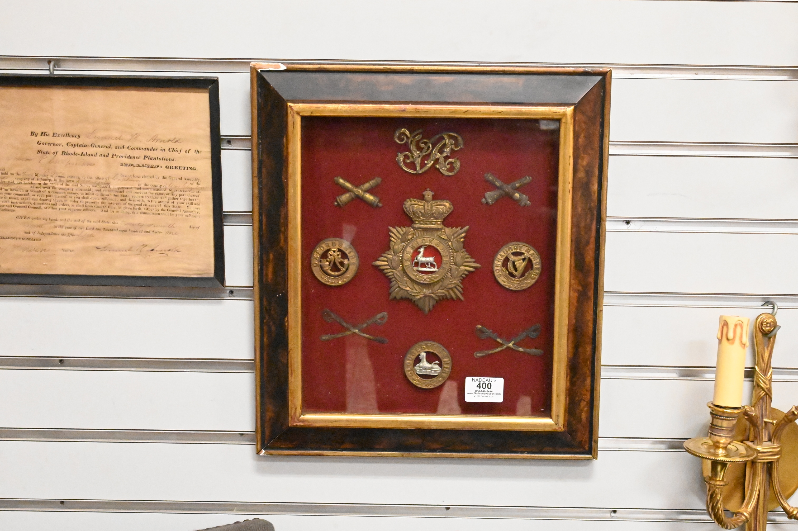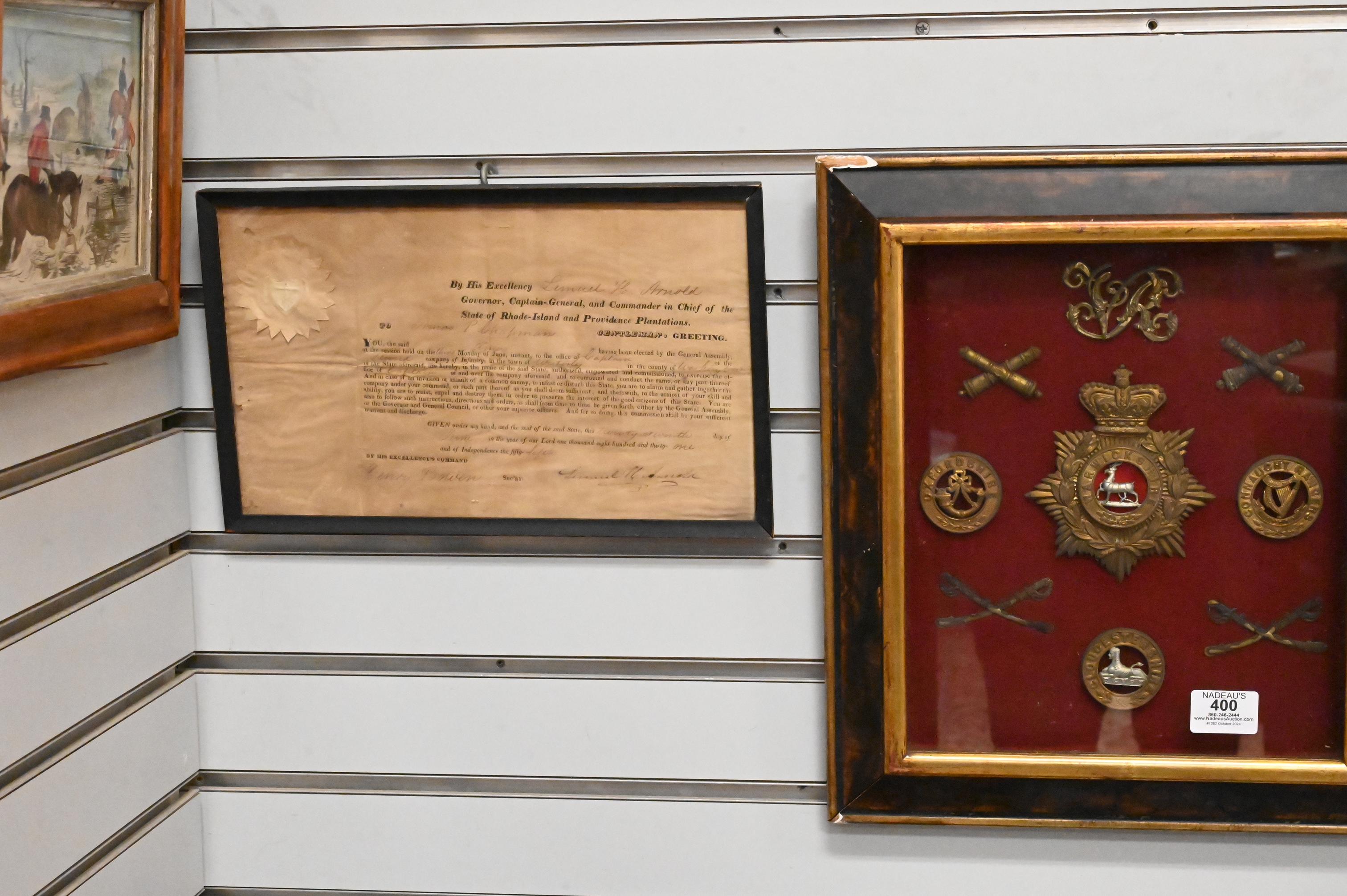 to include shadow box of various medals, swords, and cannons with Christie’s label on verso and Samuel Arnold promoting Amos Chapman to Captain 1831 Westerly, Rhode Island