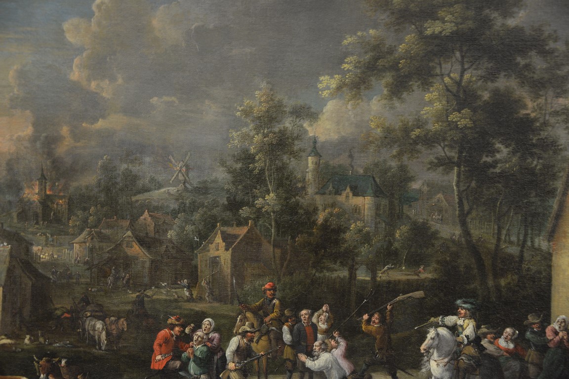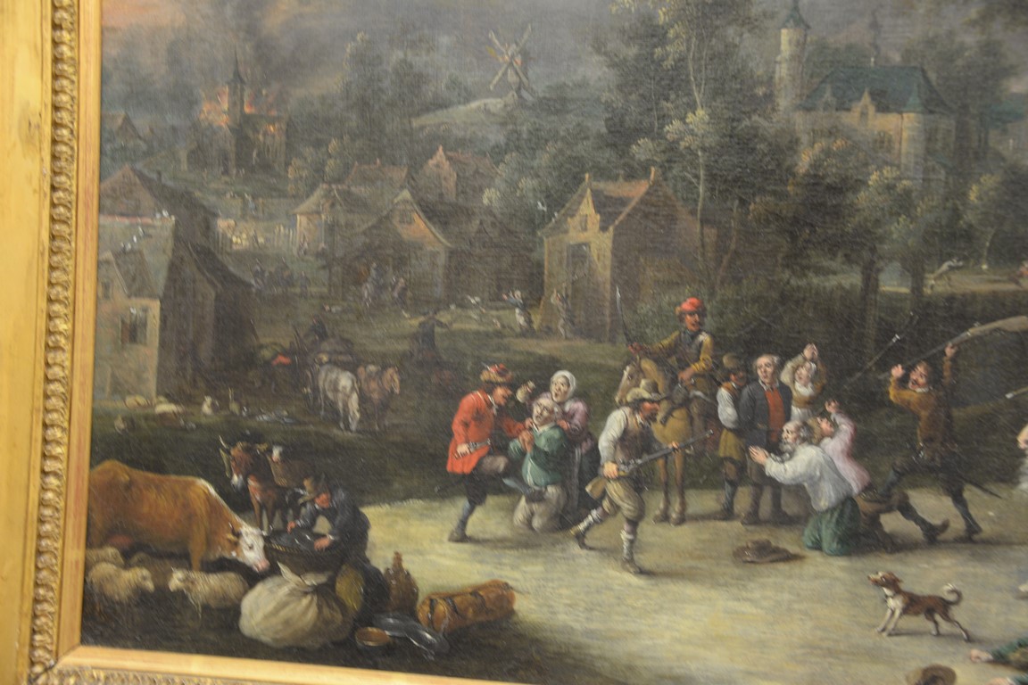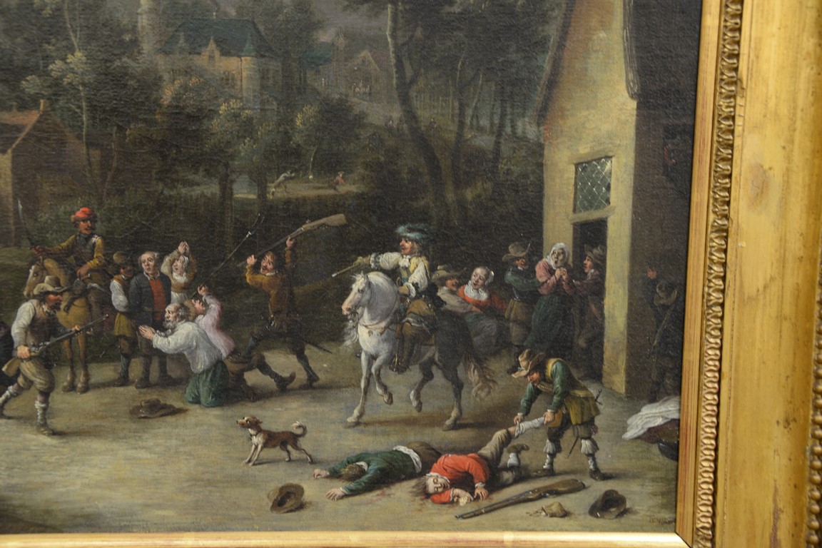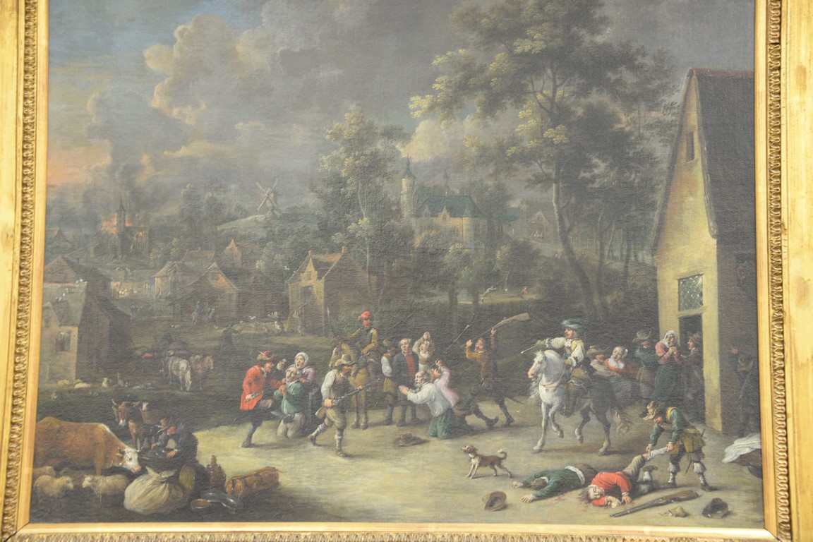 Lot 400: Teniers oil on canvas Banditti Sacking a Town signed lower right: Teniers marked on reverse: The Studio Pictures by Ten…