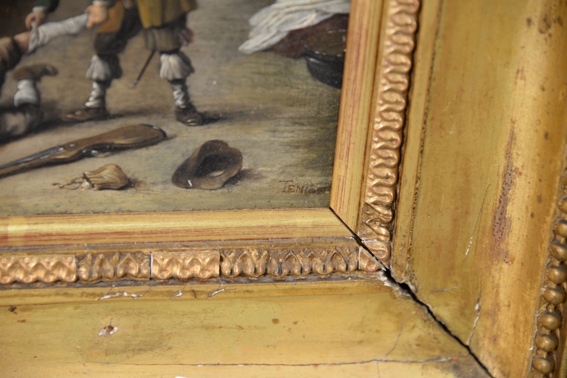 Teniers oil on canvas Banditti Sacking a Town signed lower right: Teniers marked on reverse: The Studio Pictures by Teniers Oct. 2nd 1909 relined 18 x 23