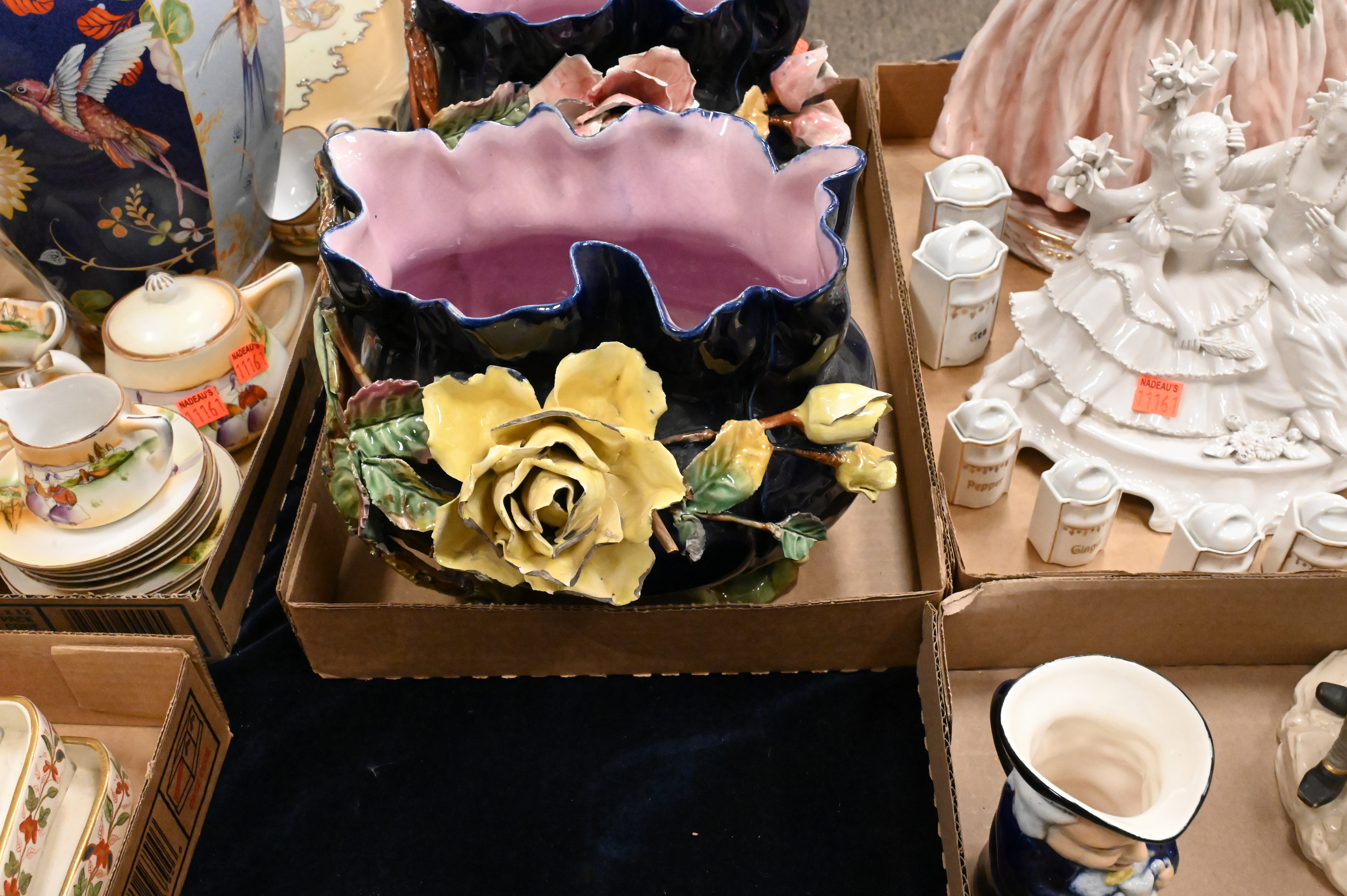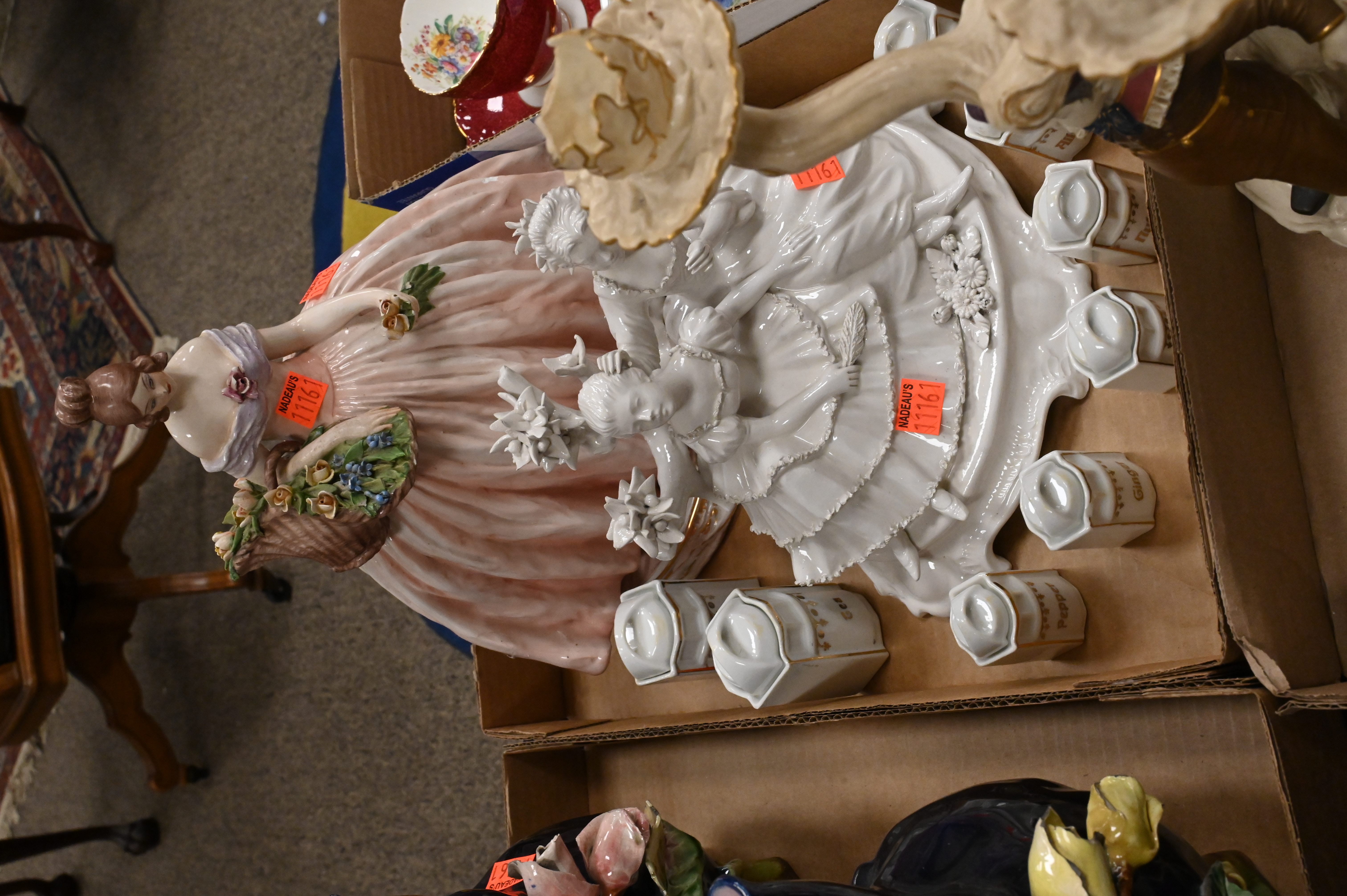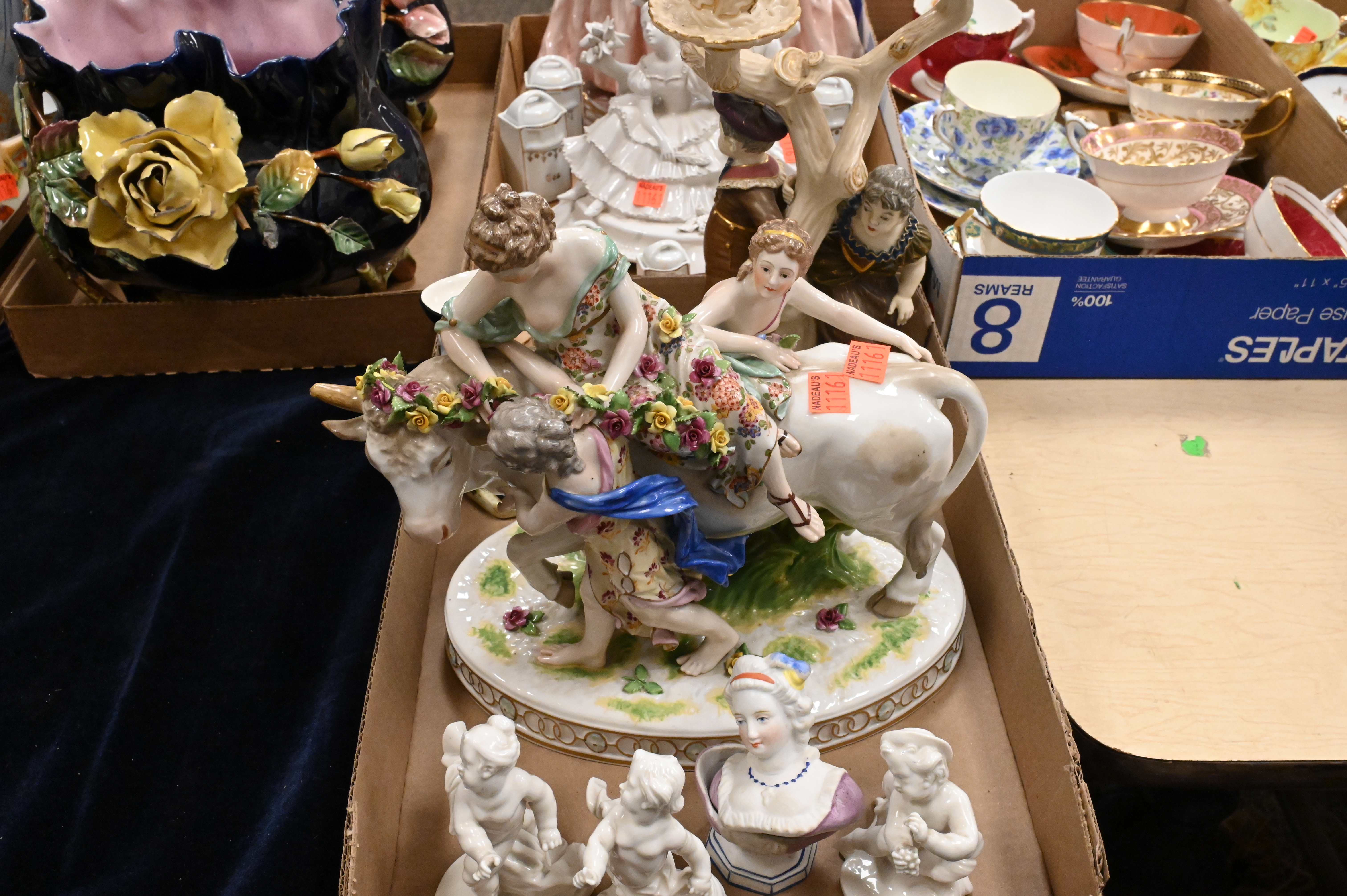 Dresden Europa and the bull with two figures, marked on underside, height 10 inches, Royal Worcester figural candelabra (repaired) Capodimonte lady in a dress, toby jug, miniature spice canisters, Majolica floral planters etc…