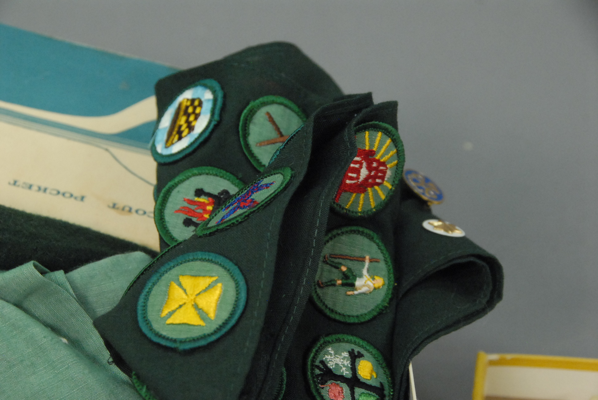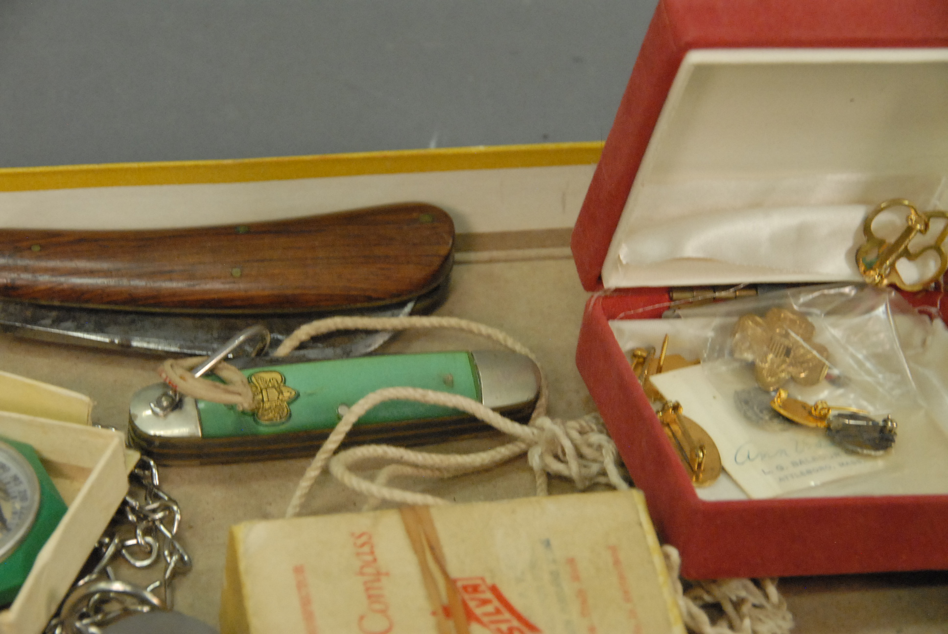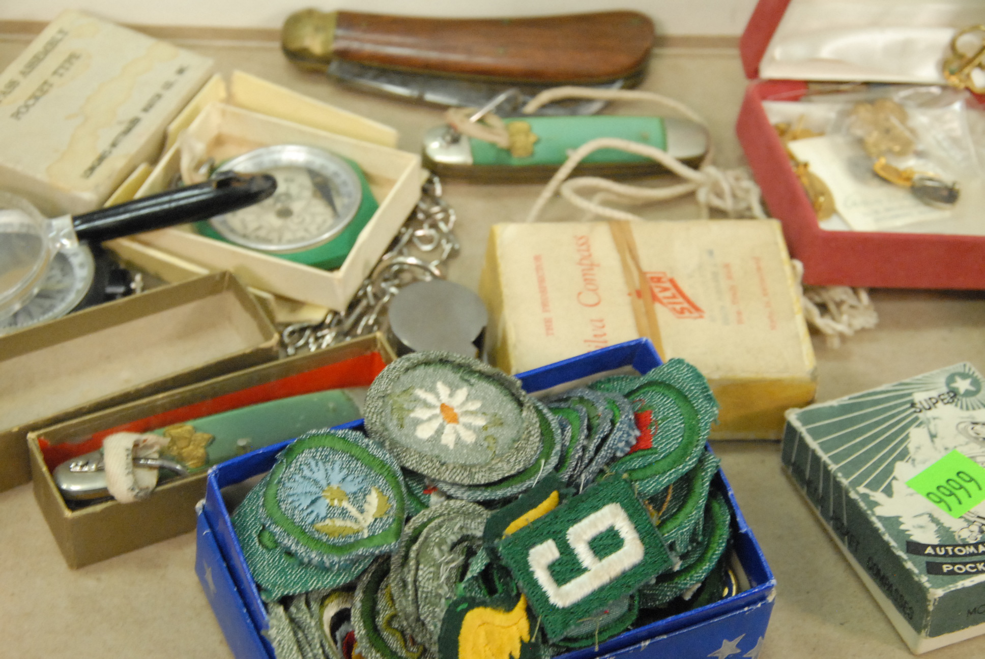 Two box lots of Boy Scout and Brownies items compasses, knives, patches, etc.