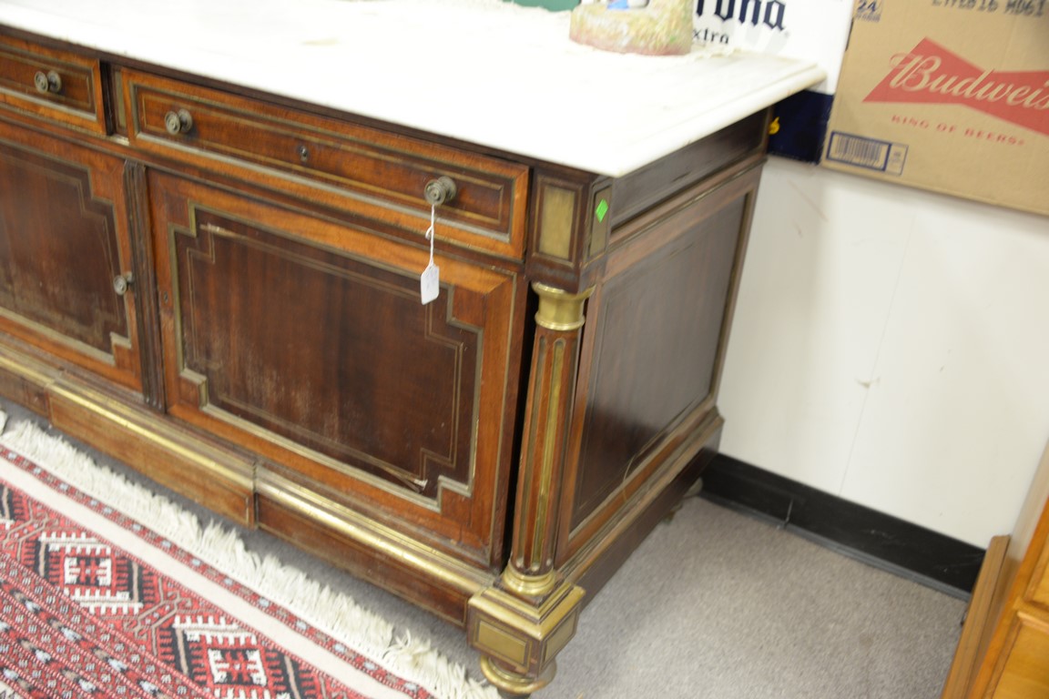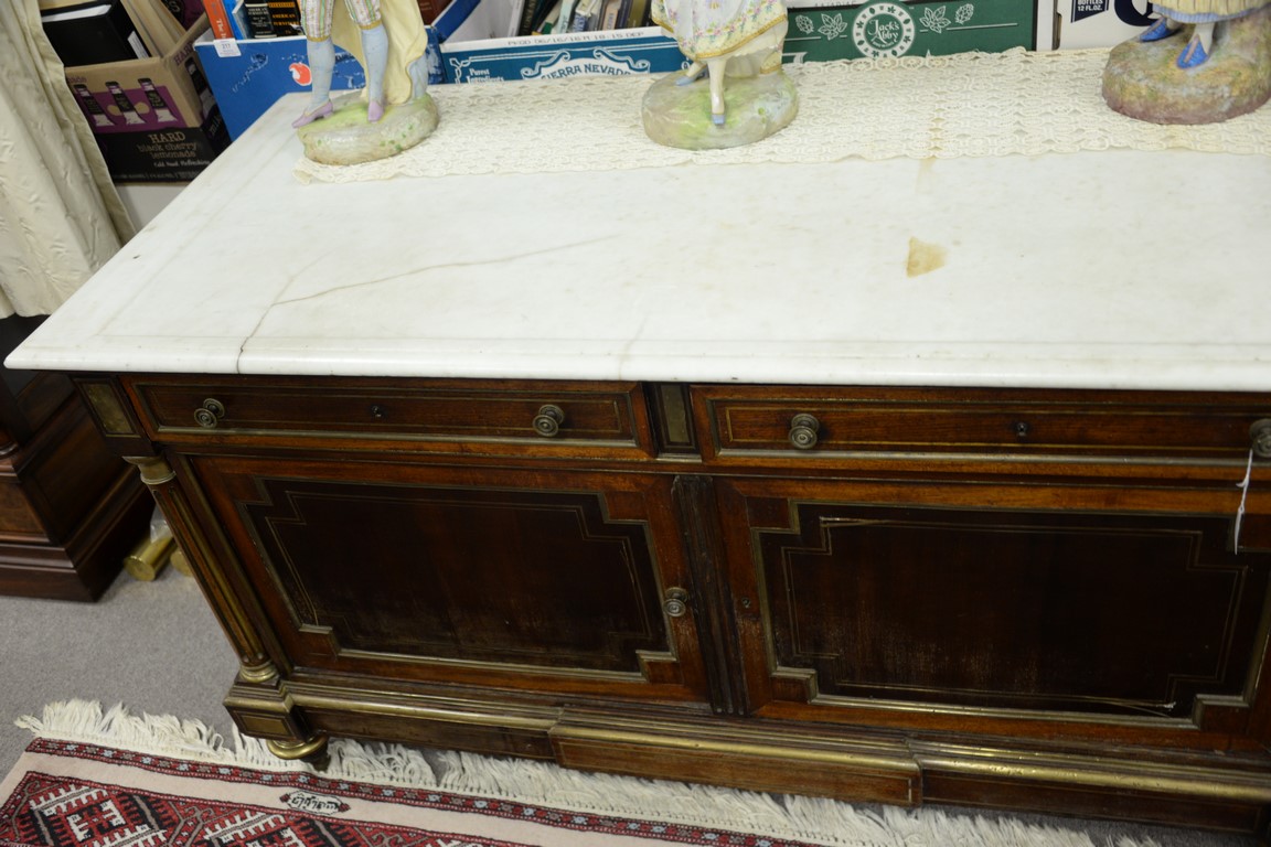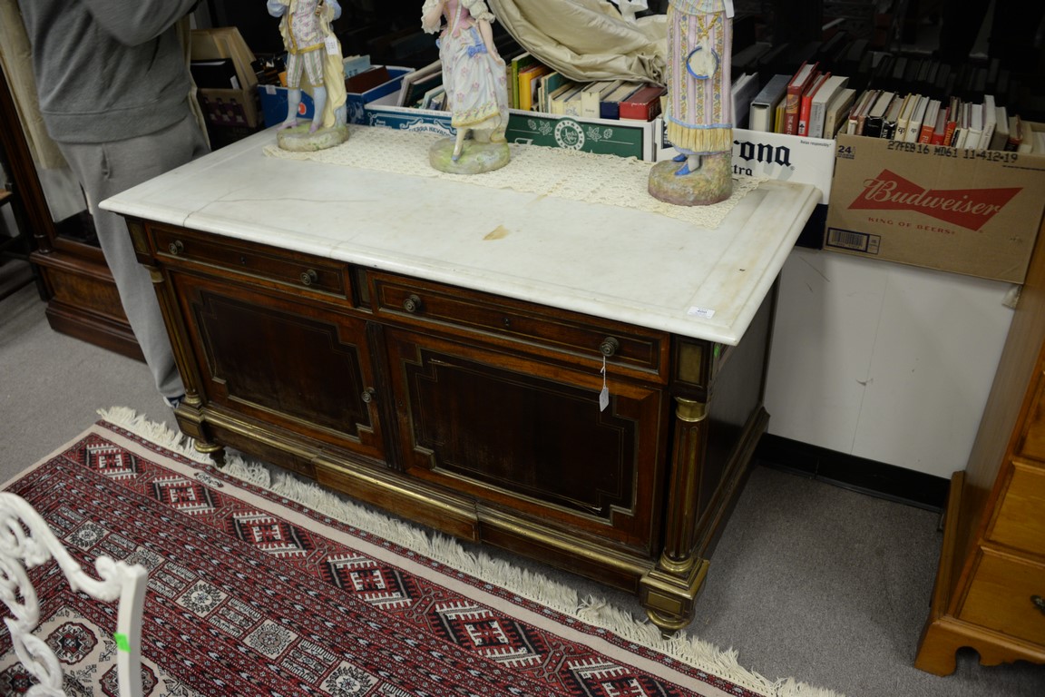 Lot 400: Victorian brass inlaid marble top chest marble partially cracked. ht. 31in., lg. 57in., dp. 26in.