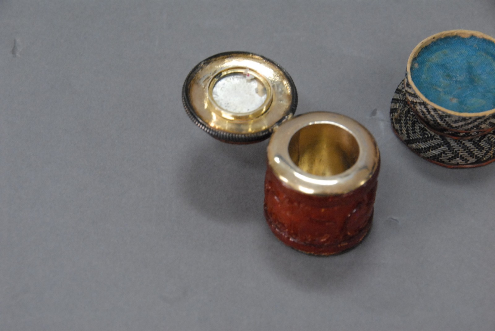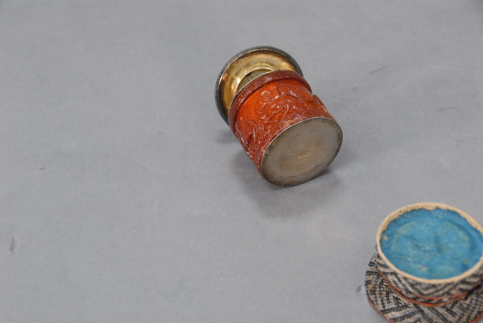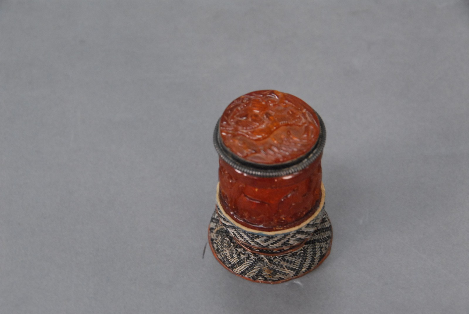 Amber and silver box with hinged lid, overall carved with horses, 19th century.