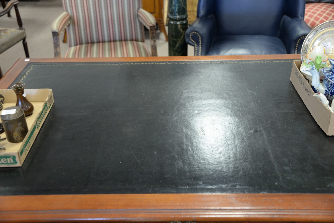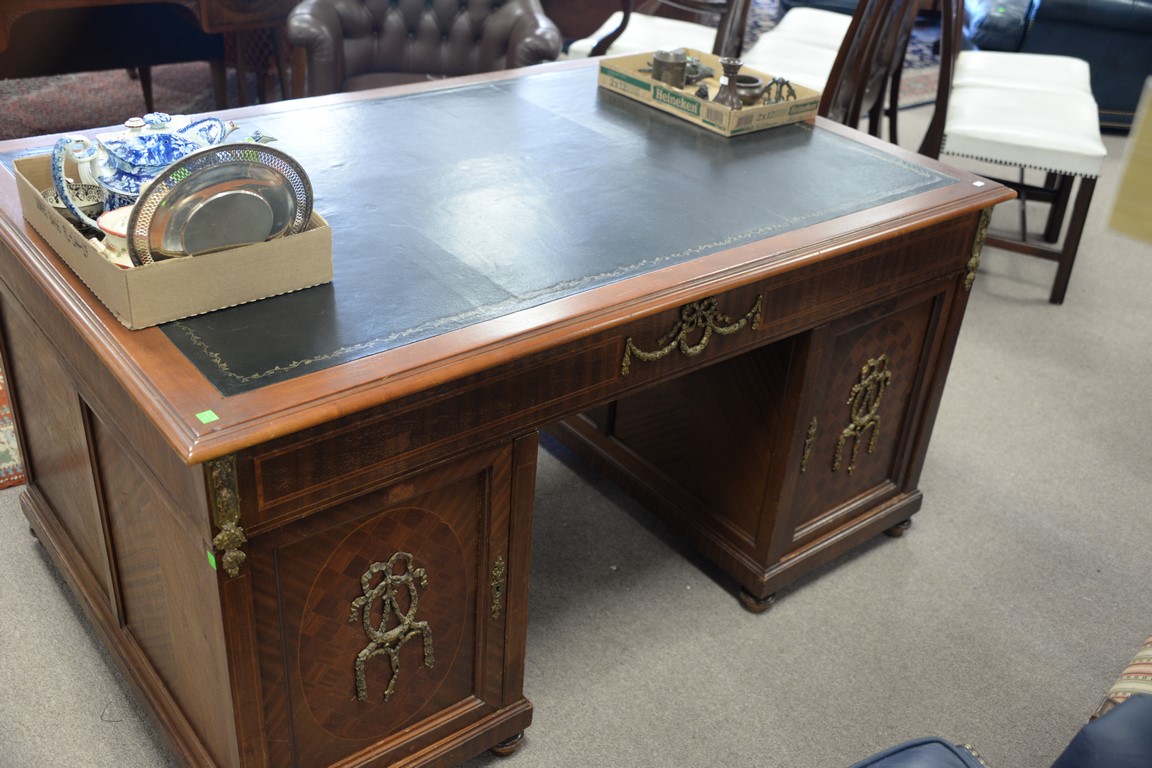 Lot 400A: French style leather top partner’s desk with inlaid and parquetry inlaid panels and bronze mounts.