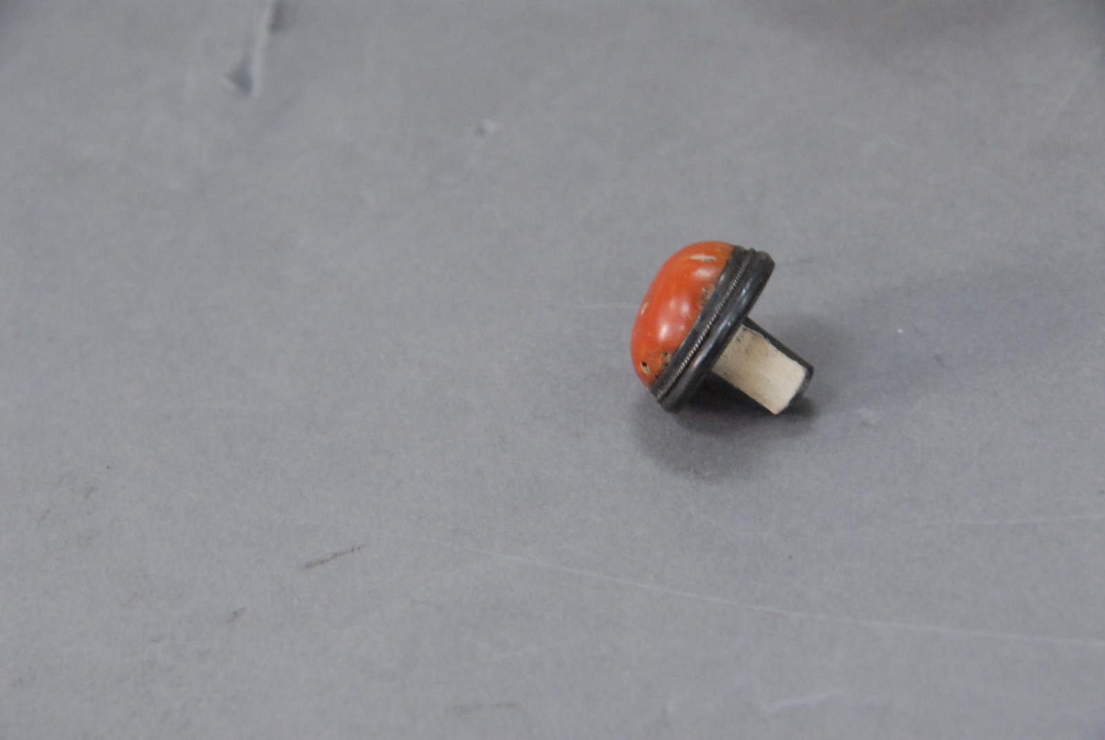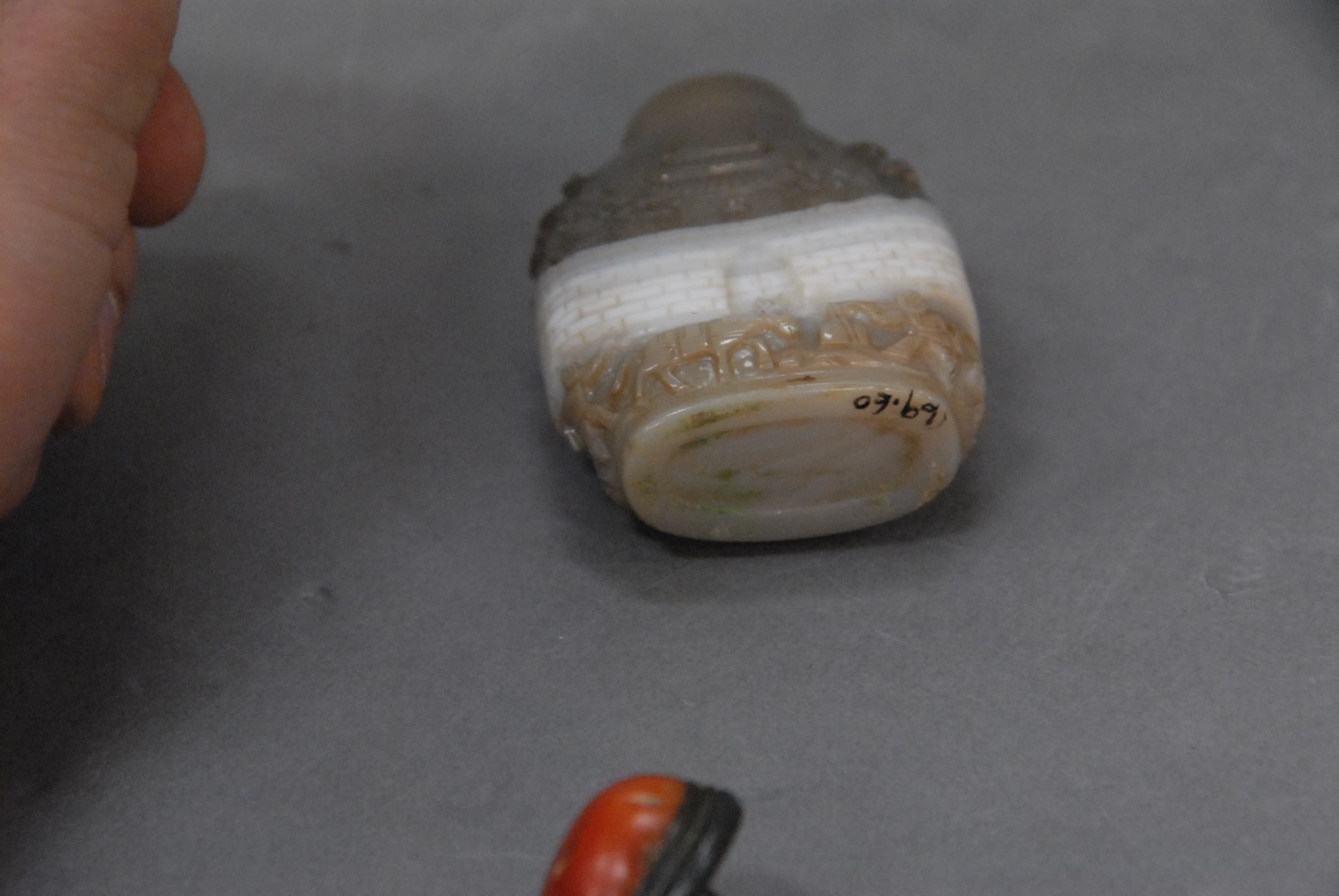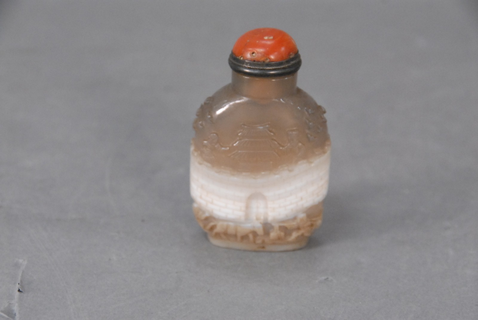 Agate snuff bottle with prominent white jade band carved palace scene with horsemen, probably 18th century.