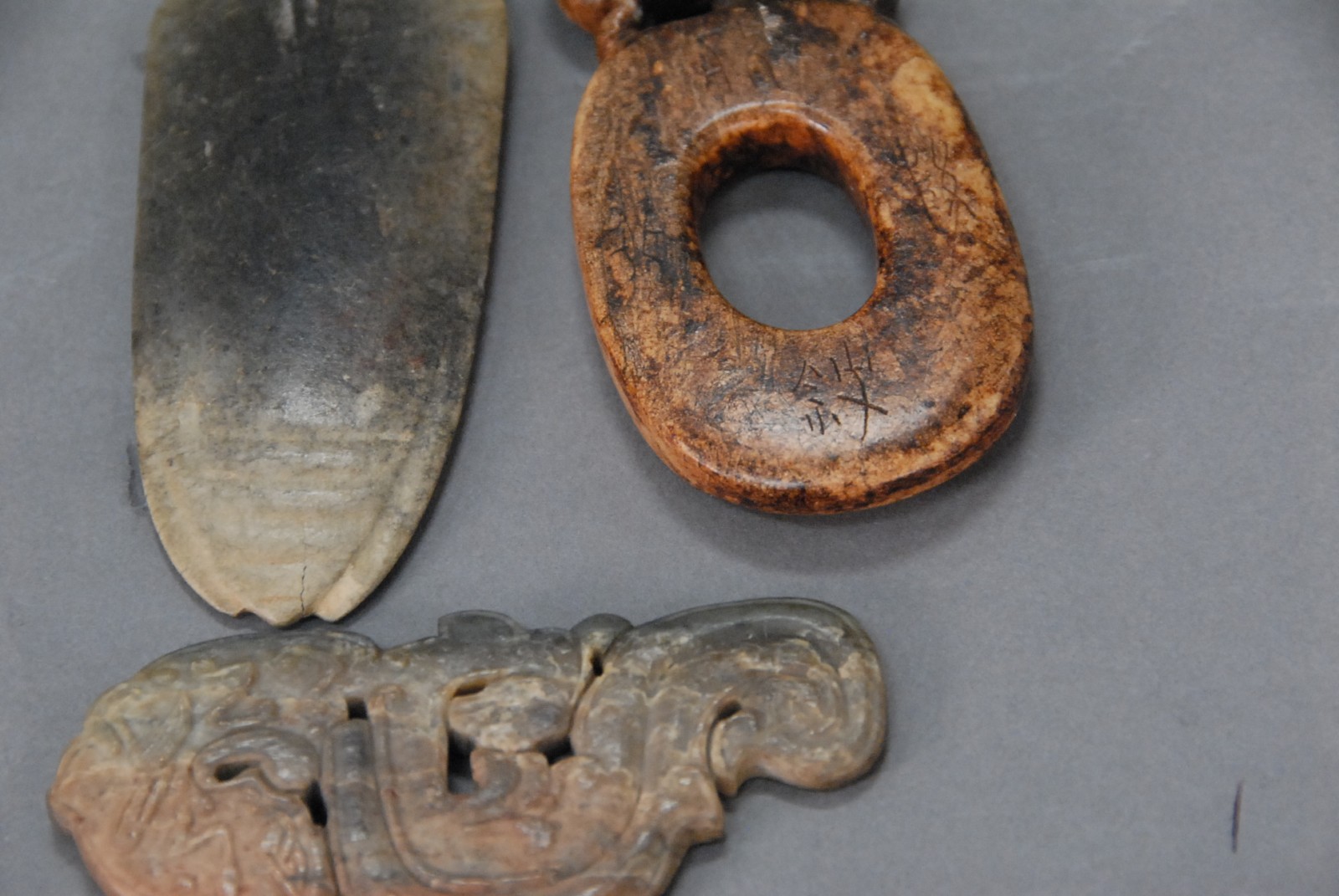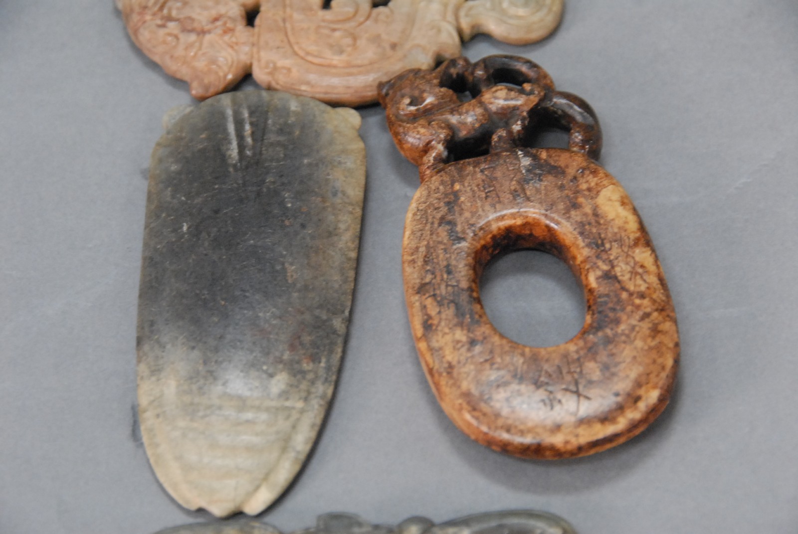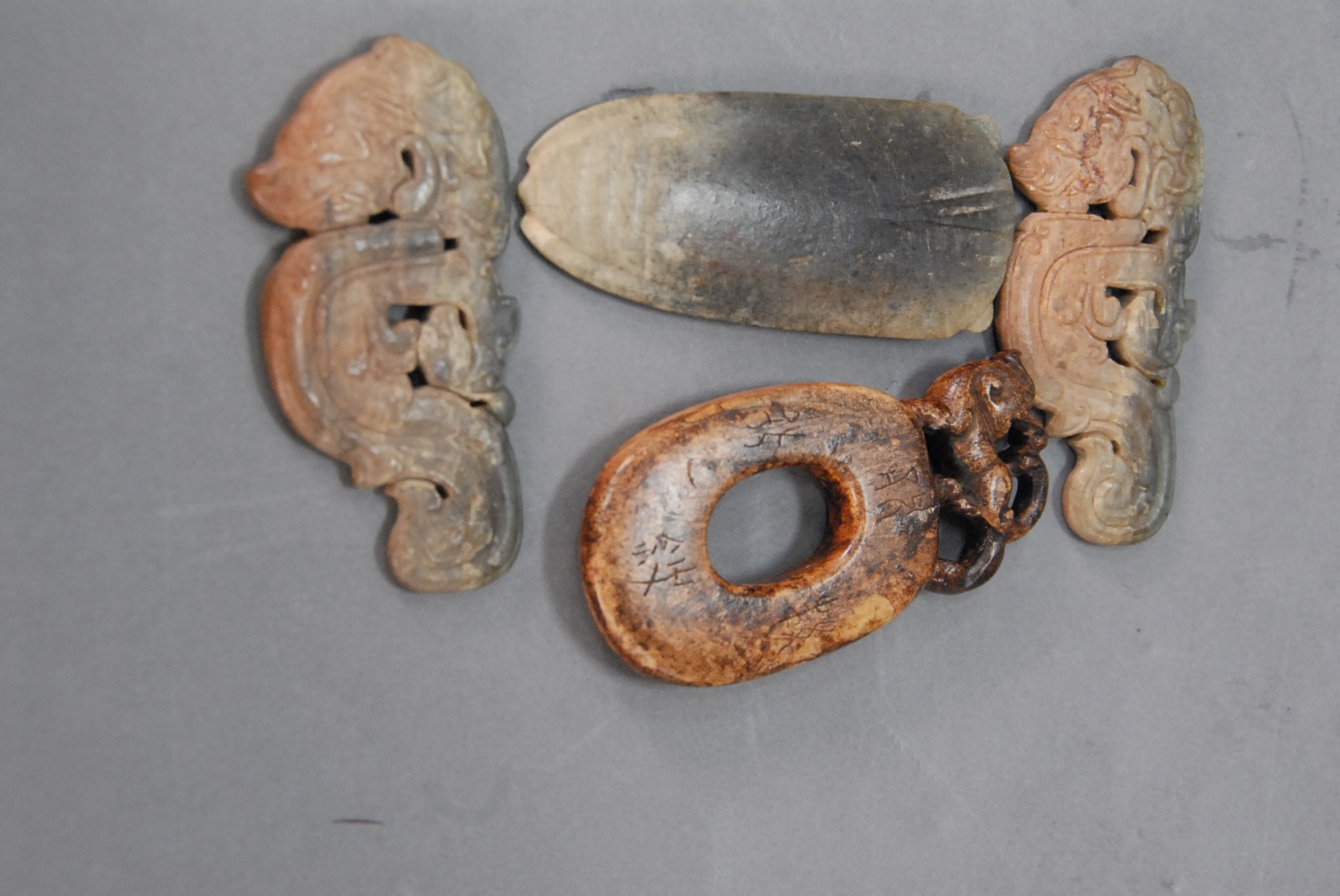 Four pieces of archaic jade, one marked with Chinese characters, one pendant in arrow form.