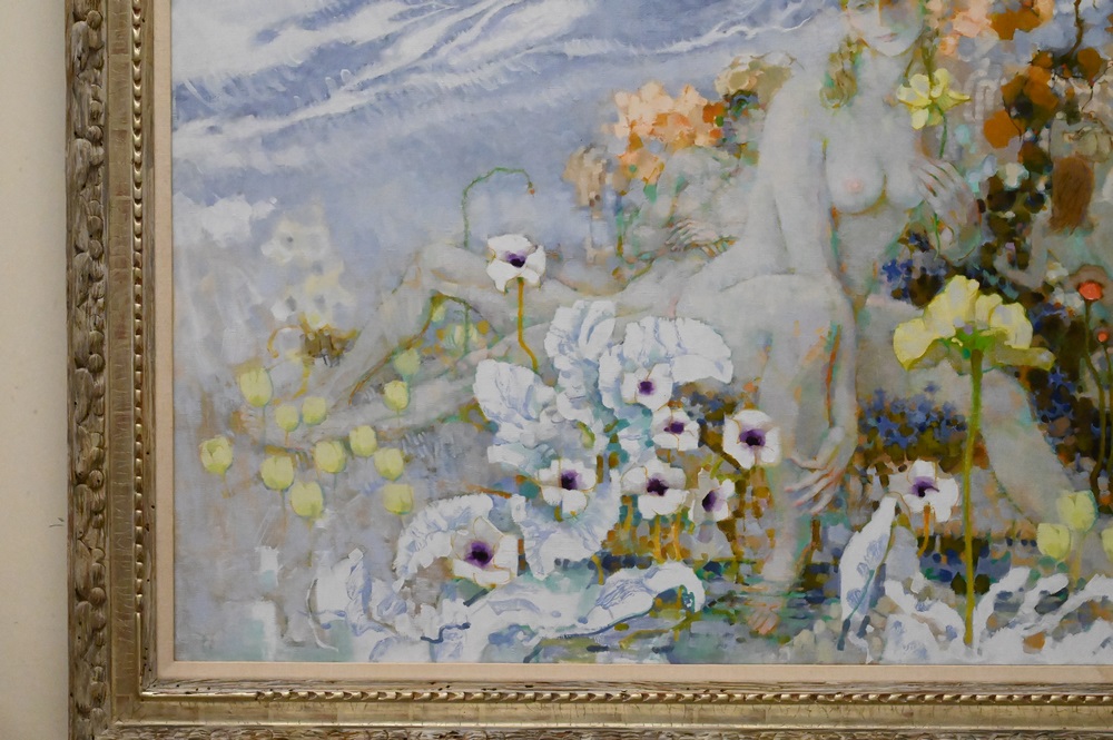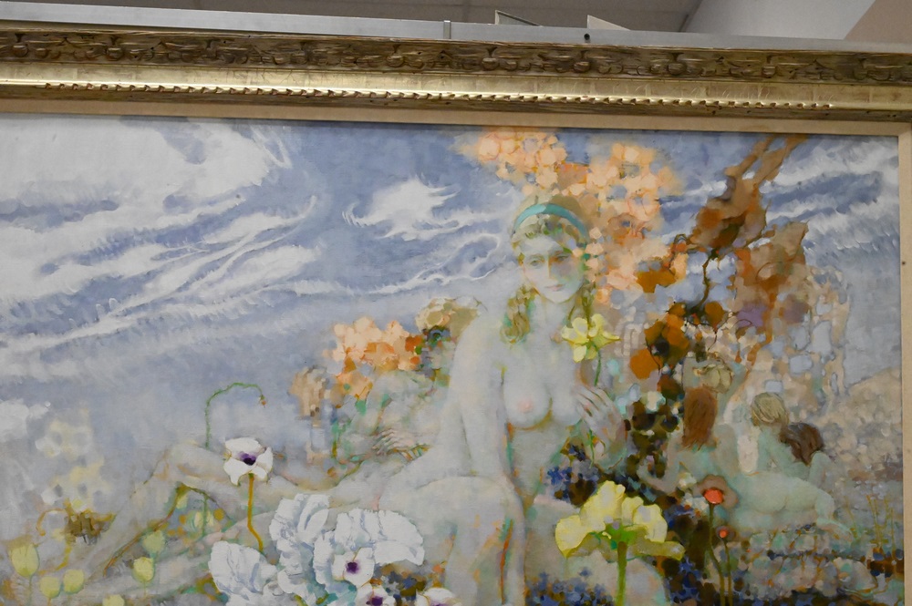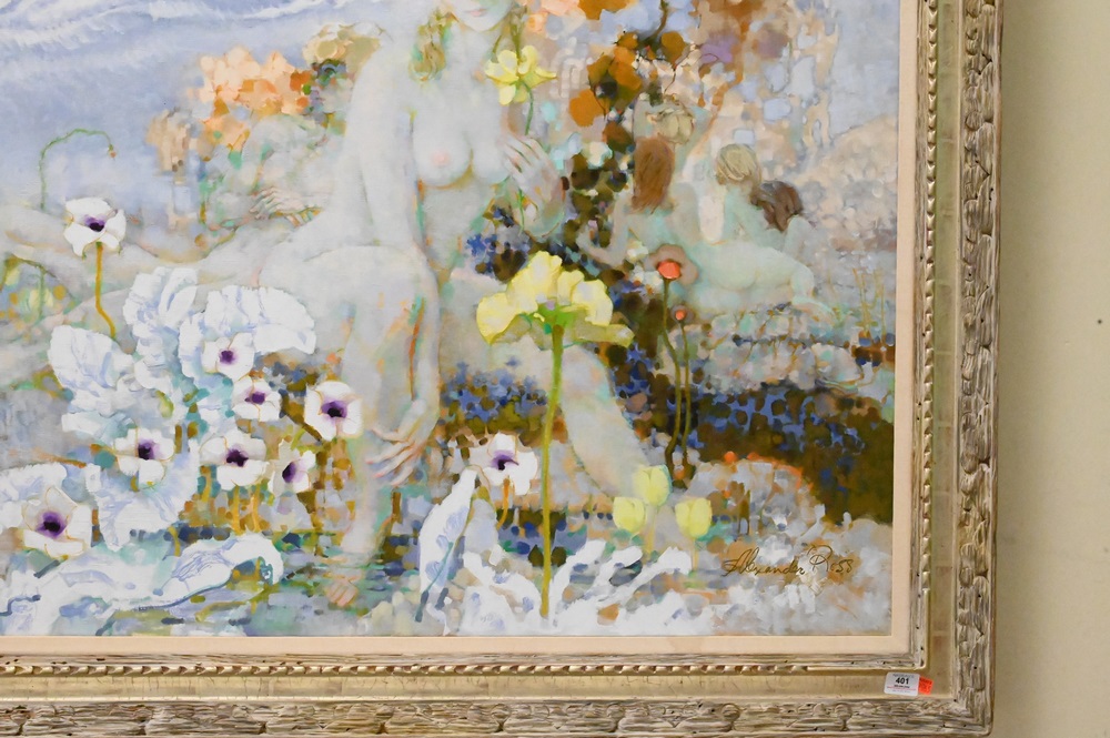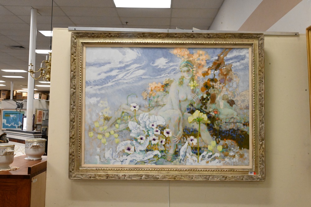 Lot 401: Alexander Ross (Scottish/American, 1908 – 1990), Nude in a Bed of Flowers, oil on canvas, signed lower right, sight size 35 1/2″ x 49 1/2″.