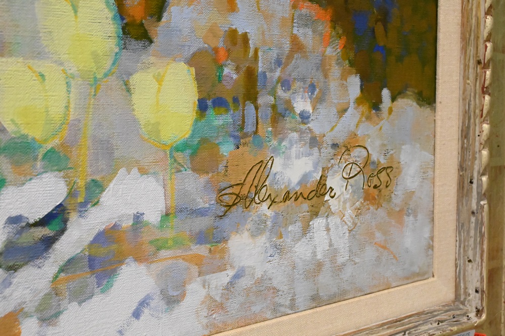 Alexander Ross (Scottish/American, 1908 – 1990), Nude in a Bed of Flowers, oil on canvas, signed lower right, sight size 35 1/2″ x 49 1/2″.