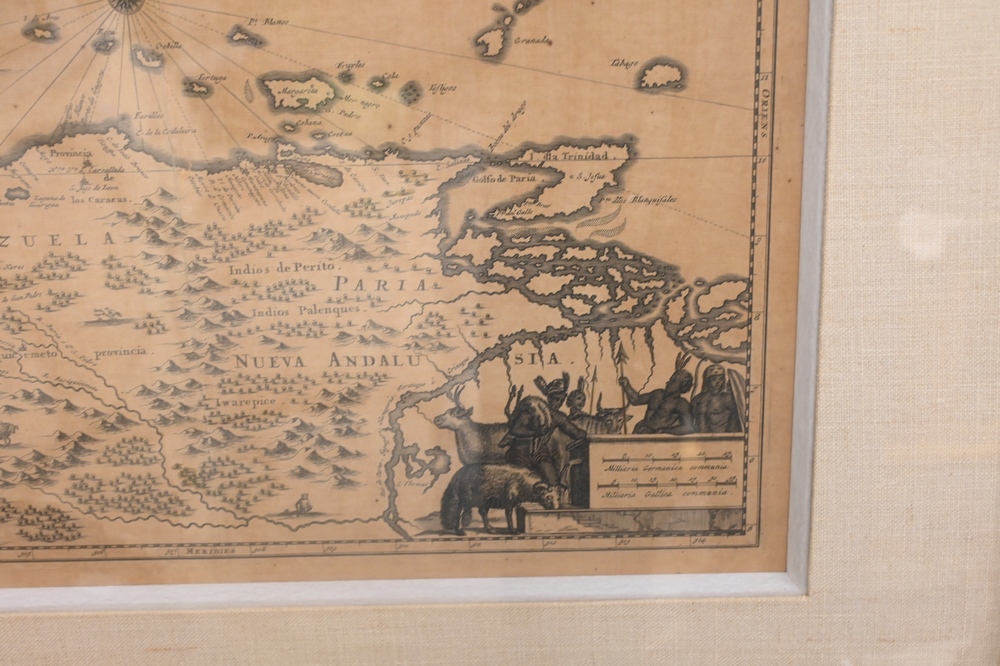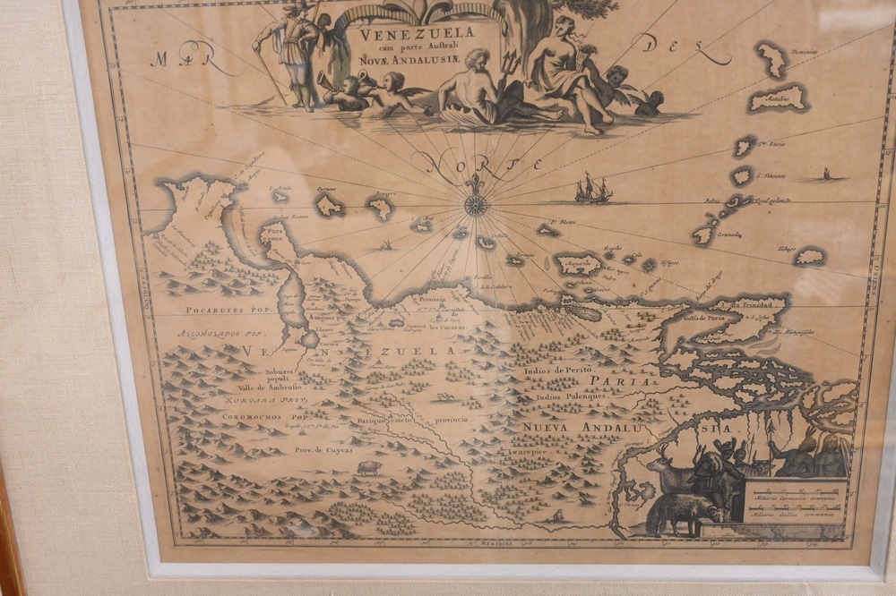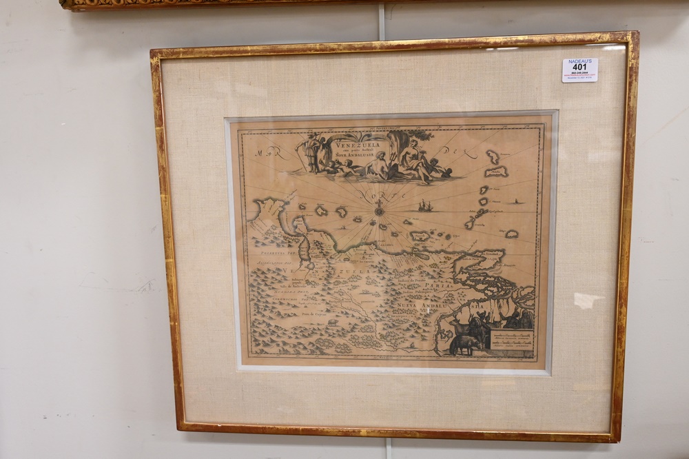 Lot 401: Arnoldus Montanus (Dutch, 1625 – 1683), “Venezuela cum parte Australia Novae Andalusia”, engraving with hand coloring on paper, sight size 12 1/2 x 15 1/2 inches.