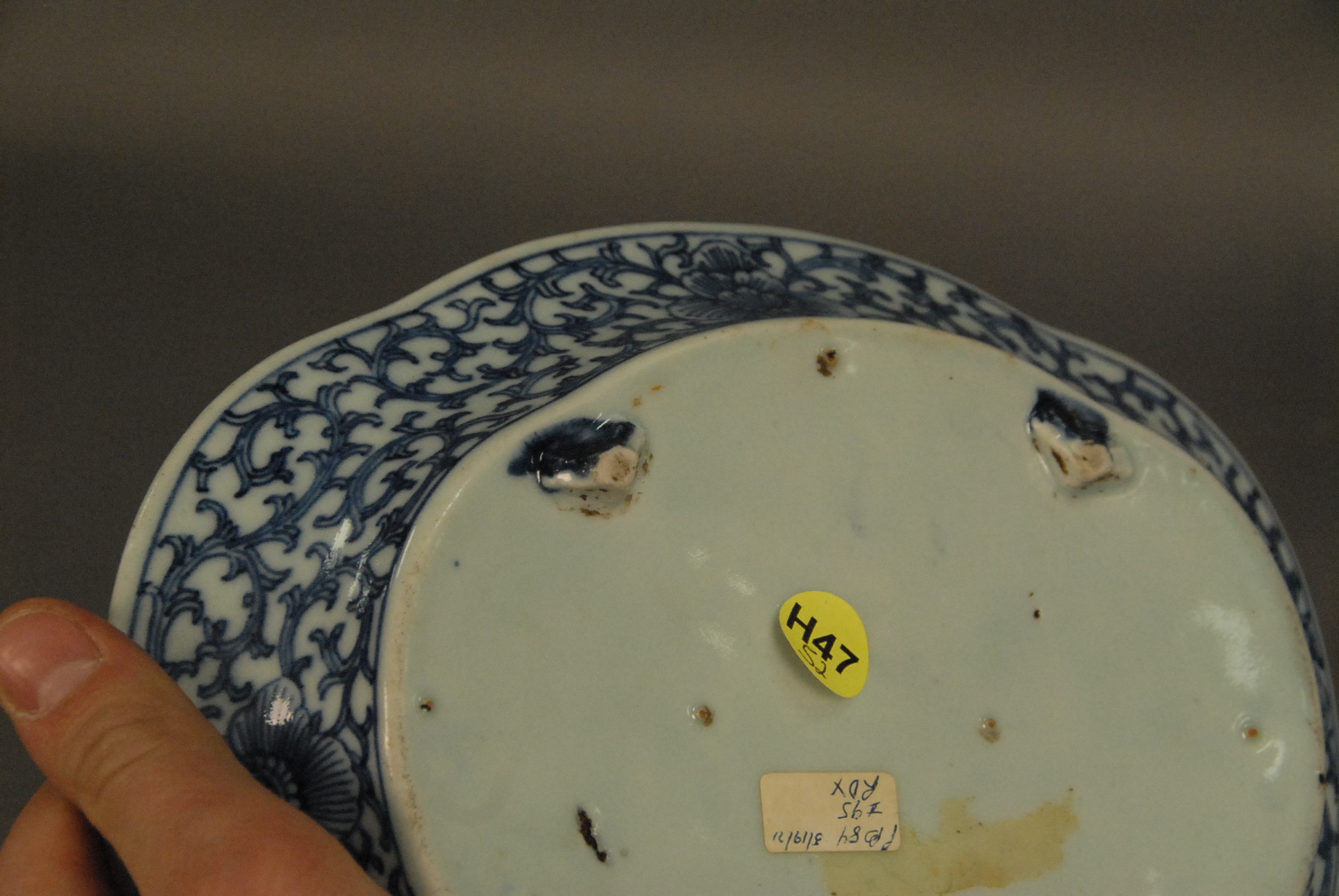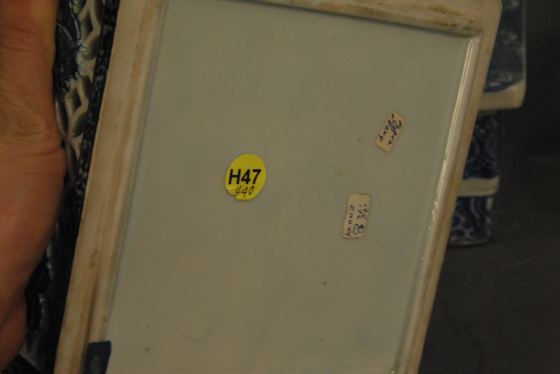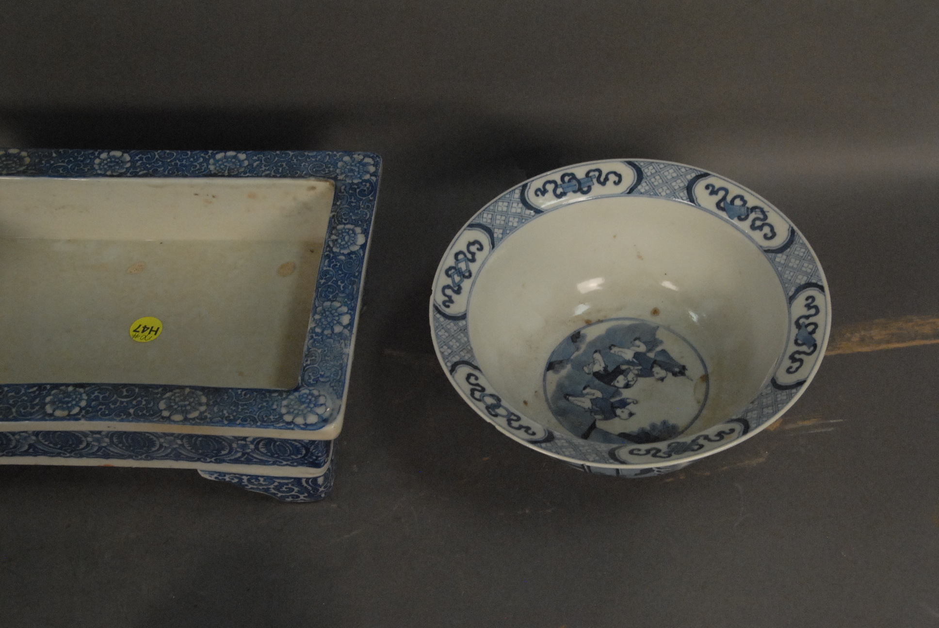 Blue and white porcelain four piece group to include a bowl with painted exterior painted courtyard scenes, rim of bowl painted with ribbons, six character mark on bottom small chips on rim and foot as is two planters one with reticulated sides and the other rectangle with footed base, and a small oblong serving dish, ht. 3 3/4, dia. 8 1/2.