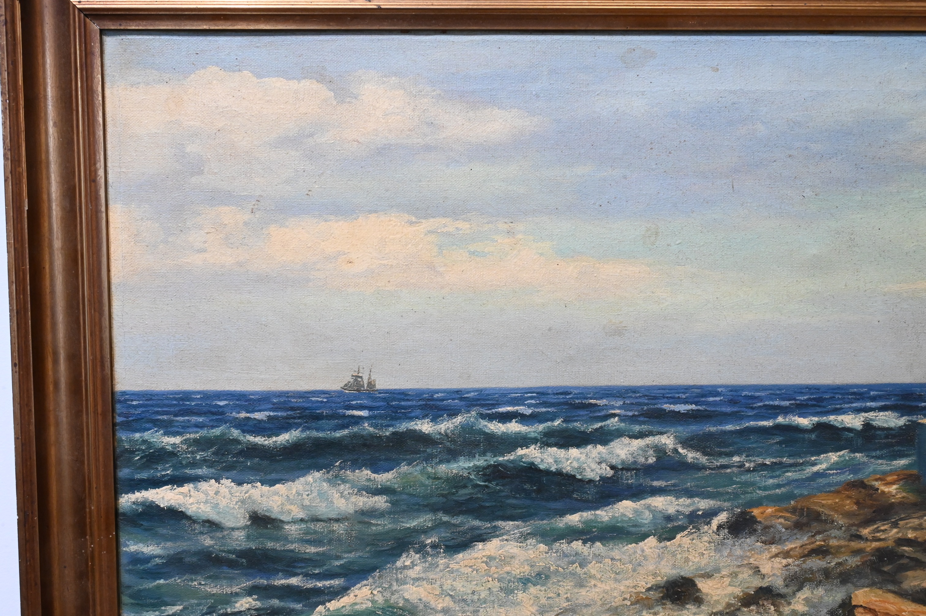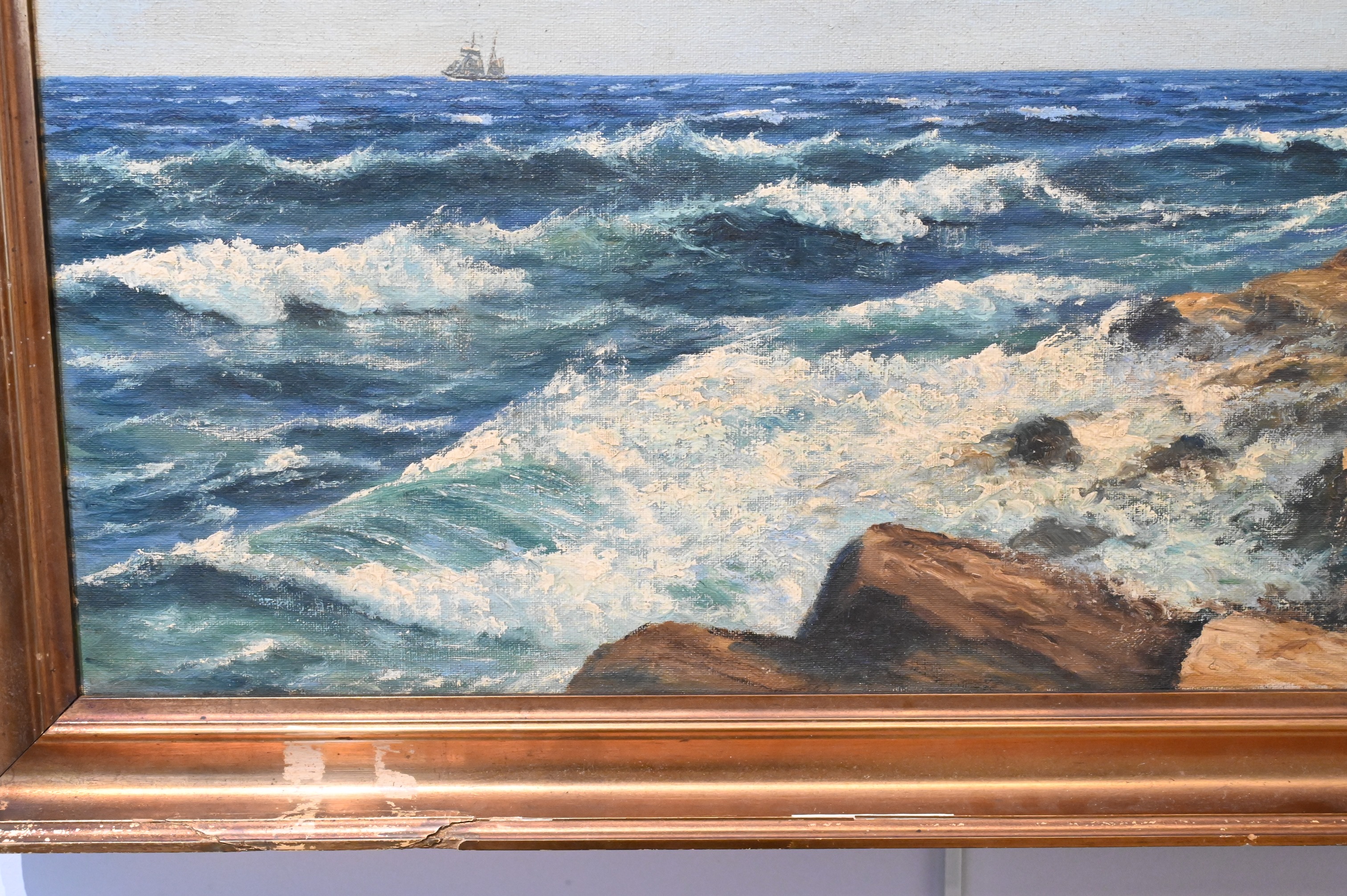 Rocky seascape with a boat in the distance