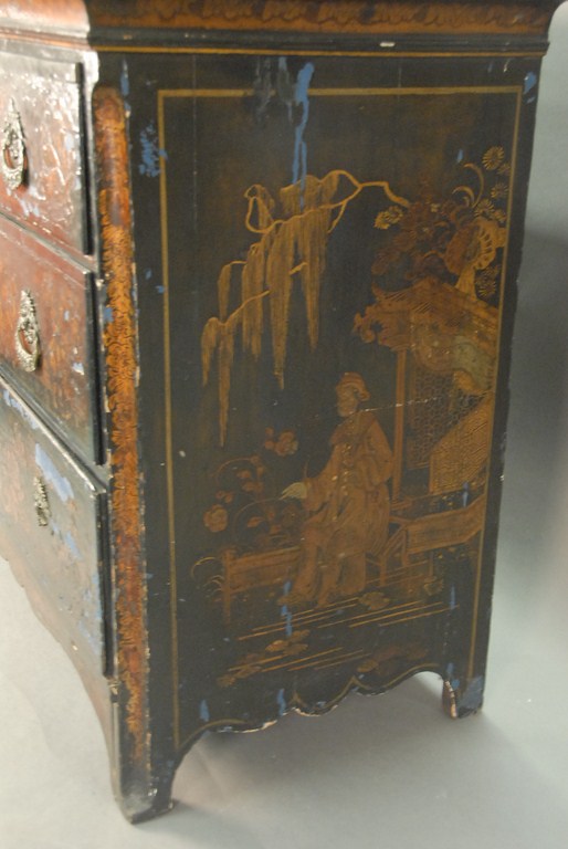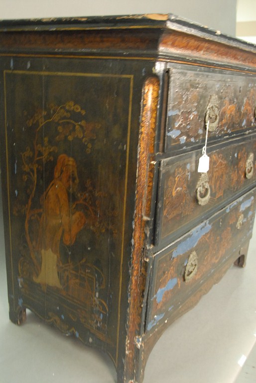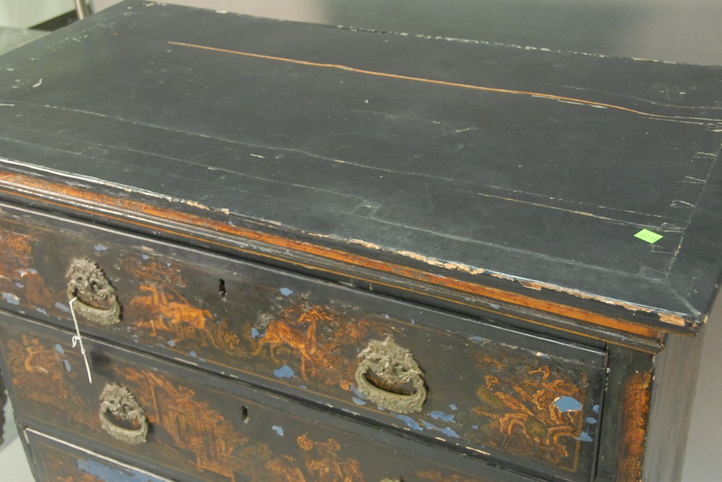 Lot 401: George II chest with three drawers with early chinoiserie decoration on small bracket foot, 18th century, possibly made from top of …