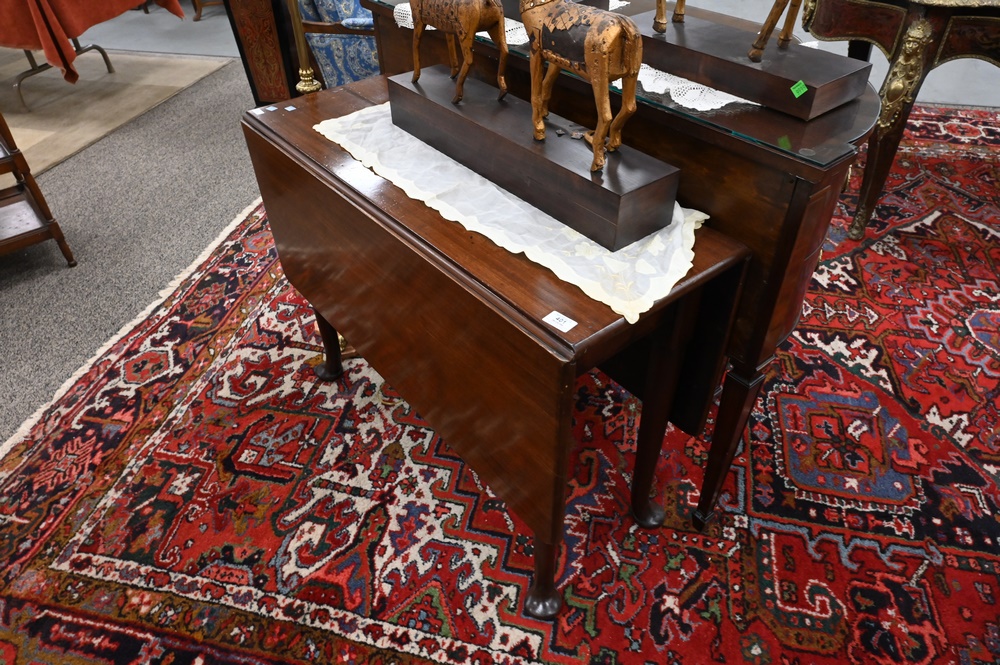 Lot 401: George II Queen Anne Mahogany Drop Leaf Table, 18th century, height 28 inches, top open 39″ x 46″.