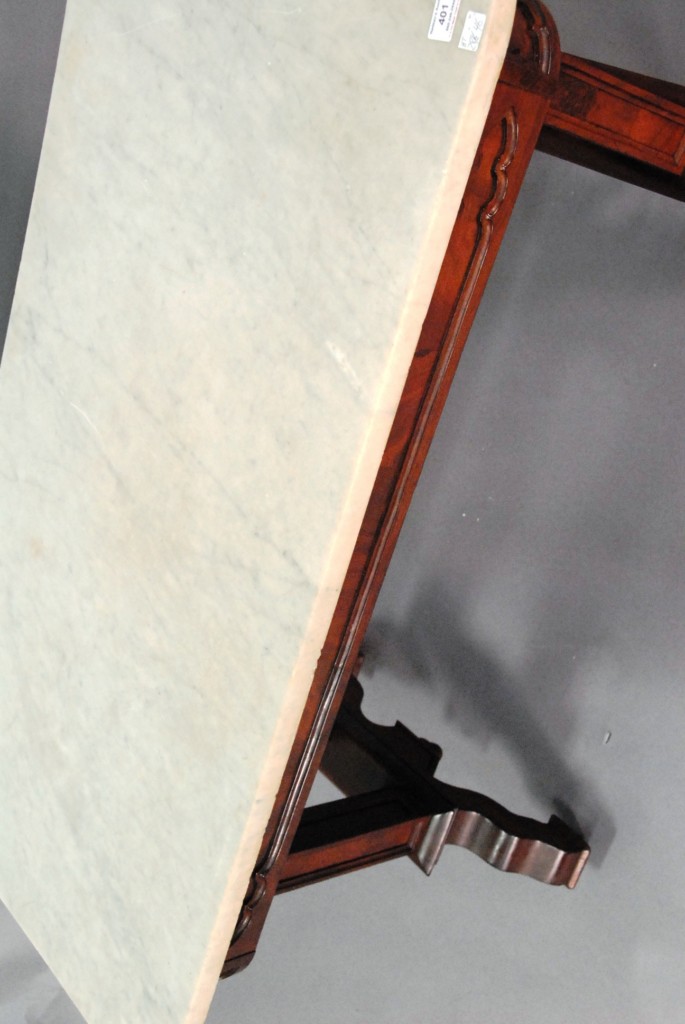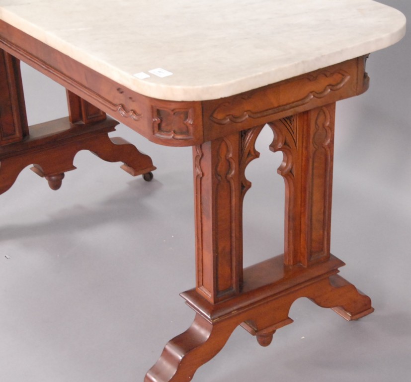 Gothic mahogany center table with rectangle marble top. Top: 28 1/2 x 46