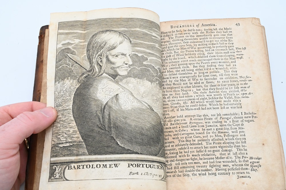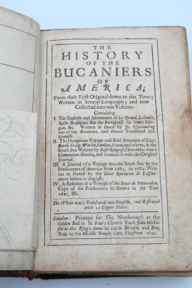 History of the Buccaneers of America From Their First Original Down To This Time, written in several languages and now collected into one volume, illustrated with 25 copper plates with maps, London 1699; along with bill of sale from Maggs Bros., LTD., London, June 1953.