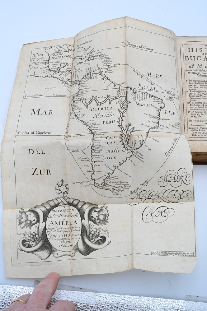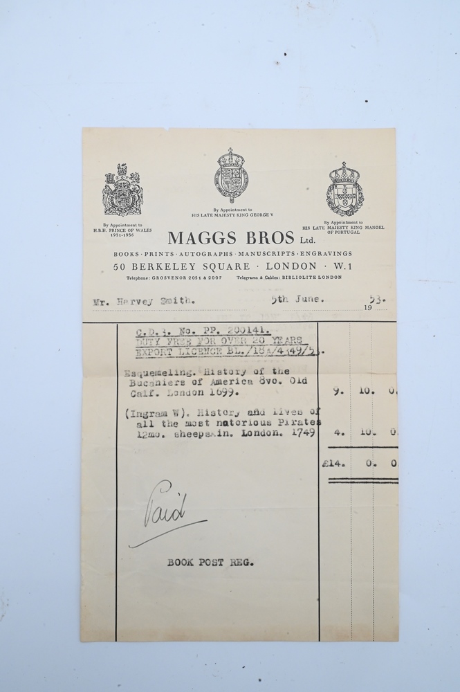Lot 401: History of the Buccaneers of America From Their First Original Down To This Time, written in several languages and now collected into one volume, illustrated with 25 copper plates with maps, London 1699; along with bill of sale from Maggs Bros., LTD., London, June 1953.