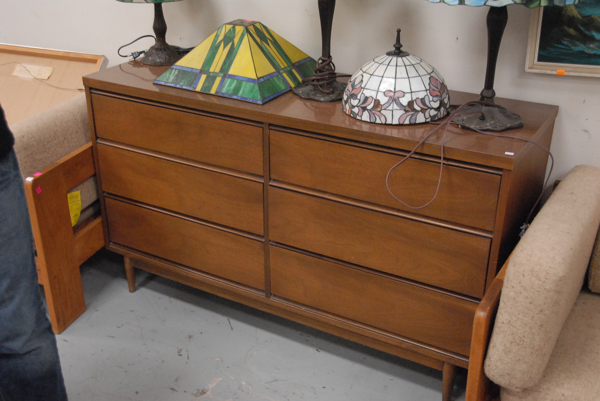 Mid Century six drawer dresser with finger pulls and laminate top in very good condition, ht. 31 1/2in. lg. 54in. dp. 18in.