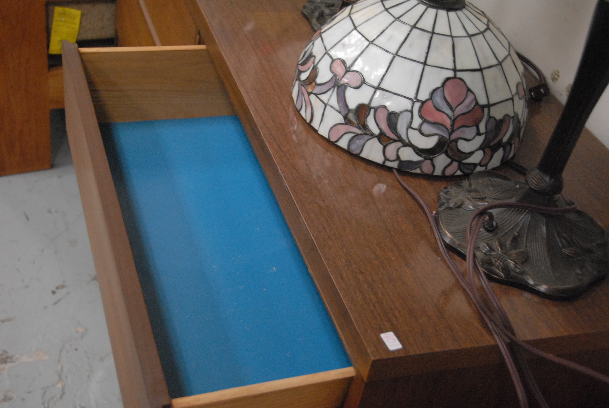 Lot 401: Mid Century six drawer dresser with finger pulls and laminate top in very good condition, ht. 31 1/2in. lg. 54in. dp. 18in.