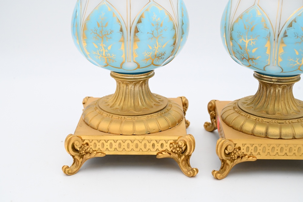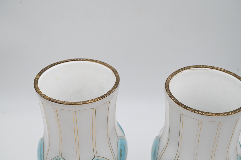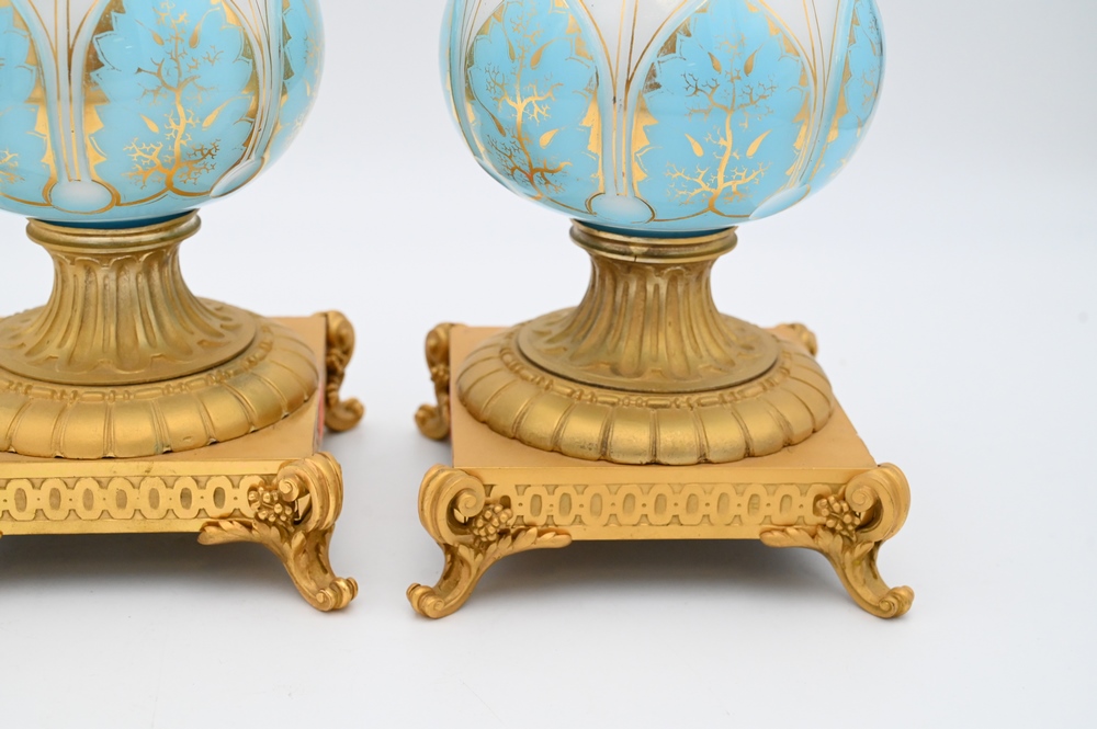 Pair of French Opaline and Bronze Urns, having blue and white opaline glass on gilt bronze bases, height 12 1/4 inches, repaired tops.