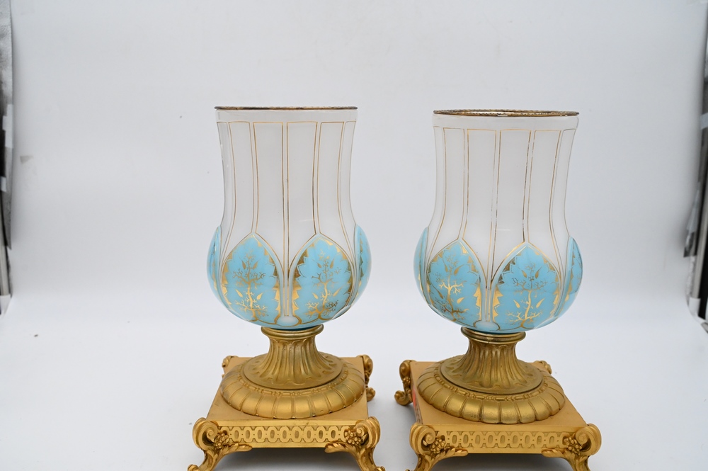 Lot 401: Pair of French Opaline and Bronze Urns, having blue and white opaline glass on gilt bronze bases, height 12 1/4 inches, repaired tops.