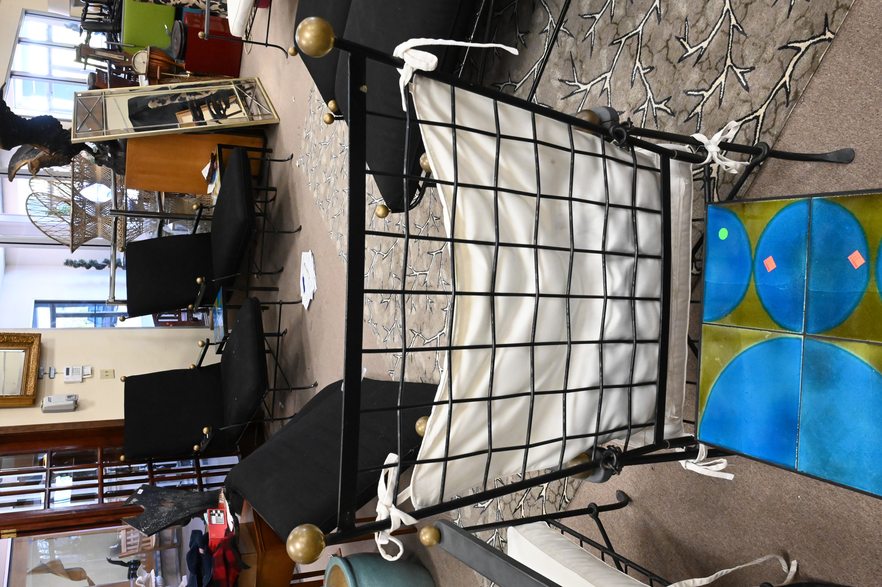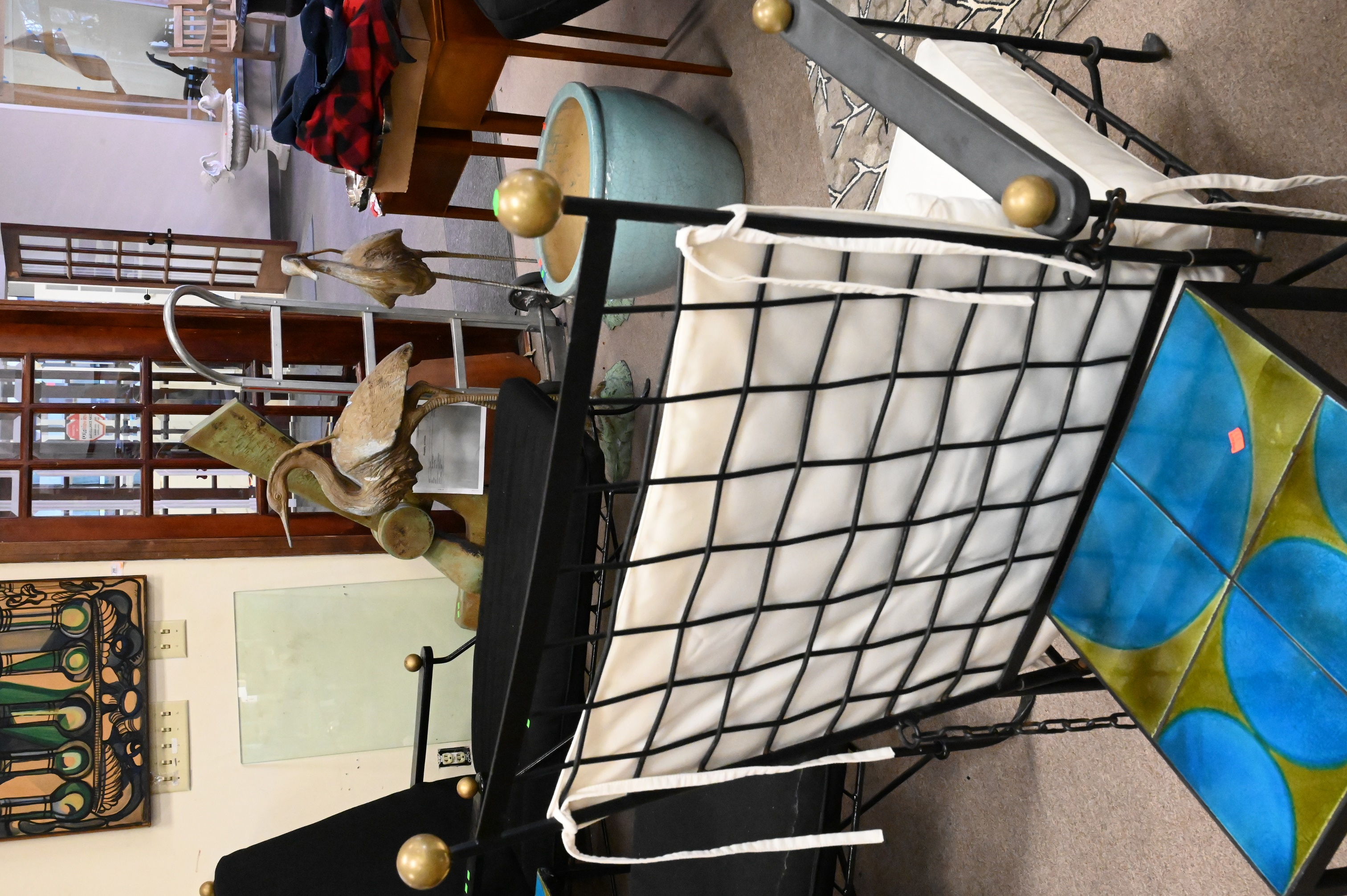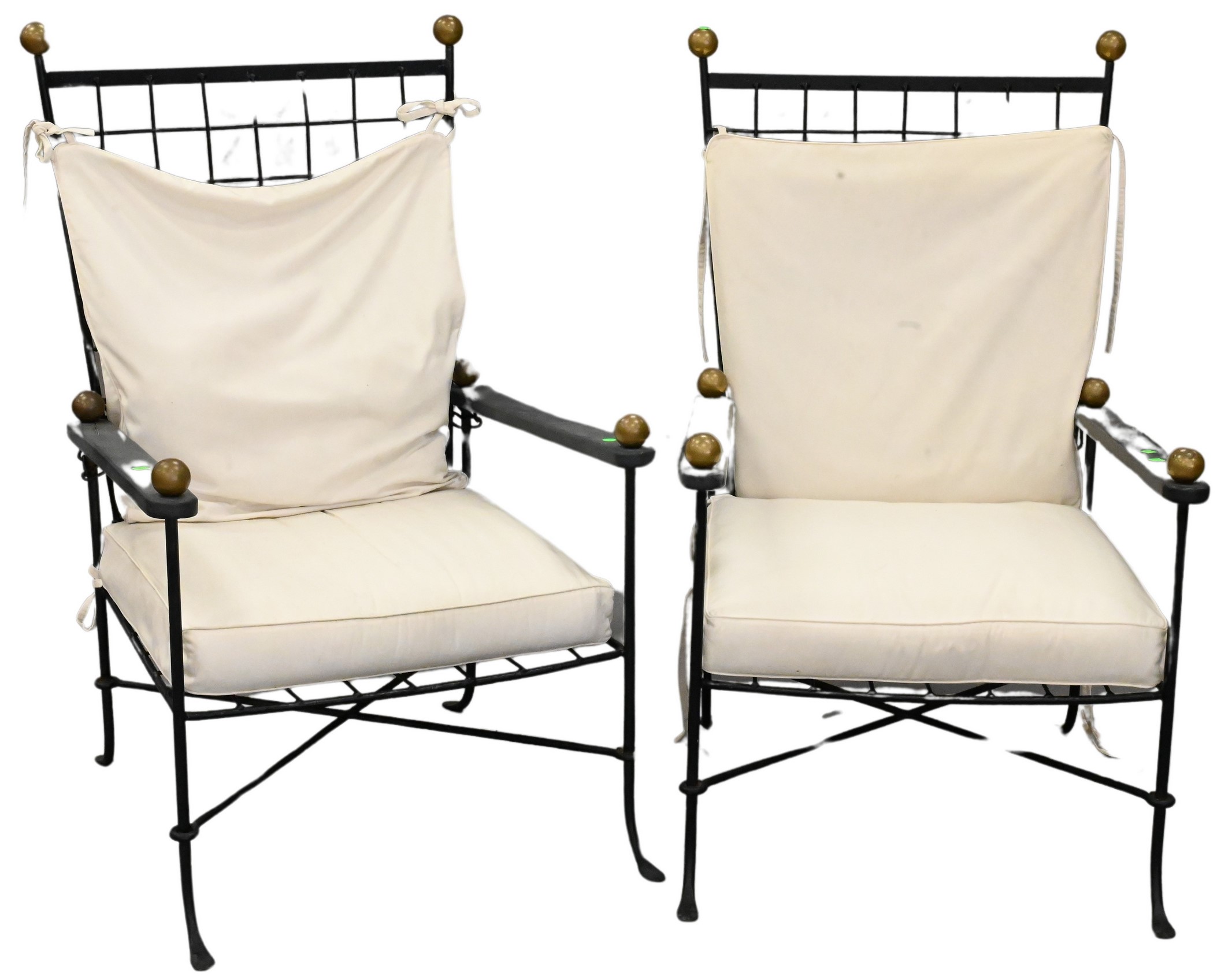 wrought iron woven design having brass ball finials and chains for adjustable back along with white cushions