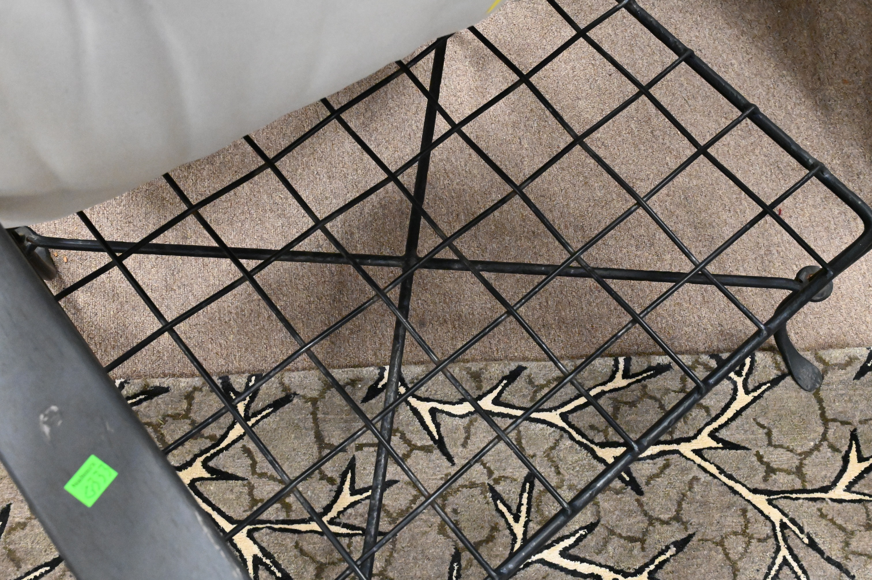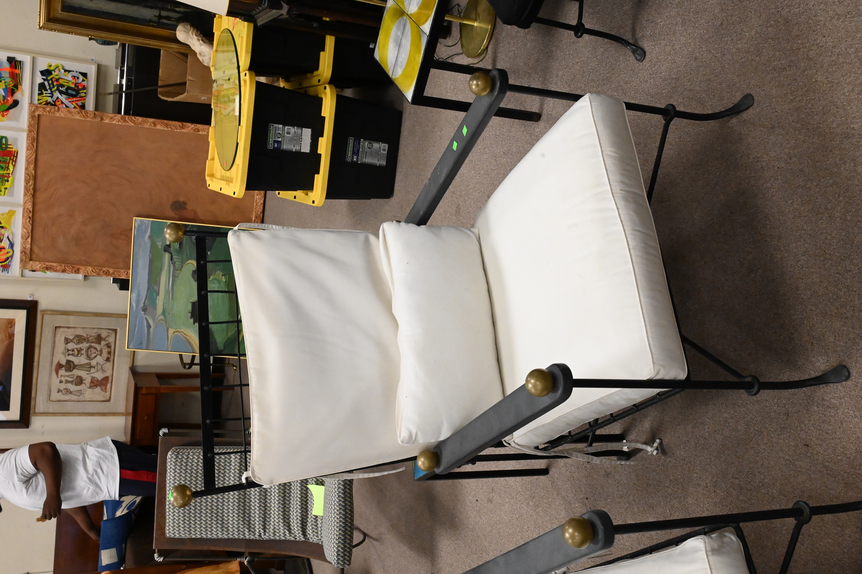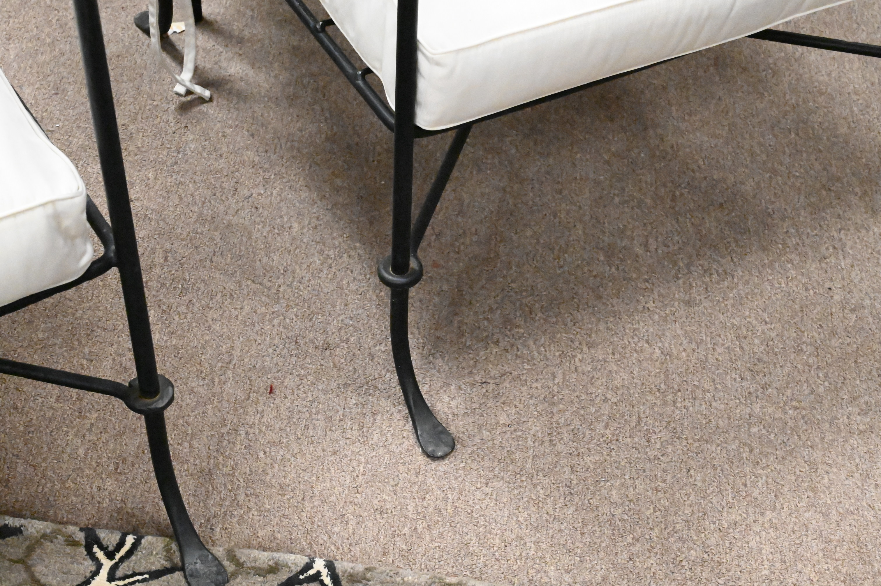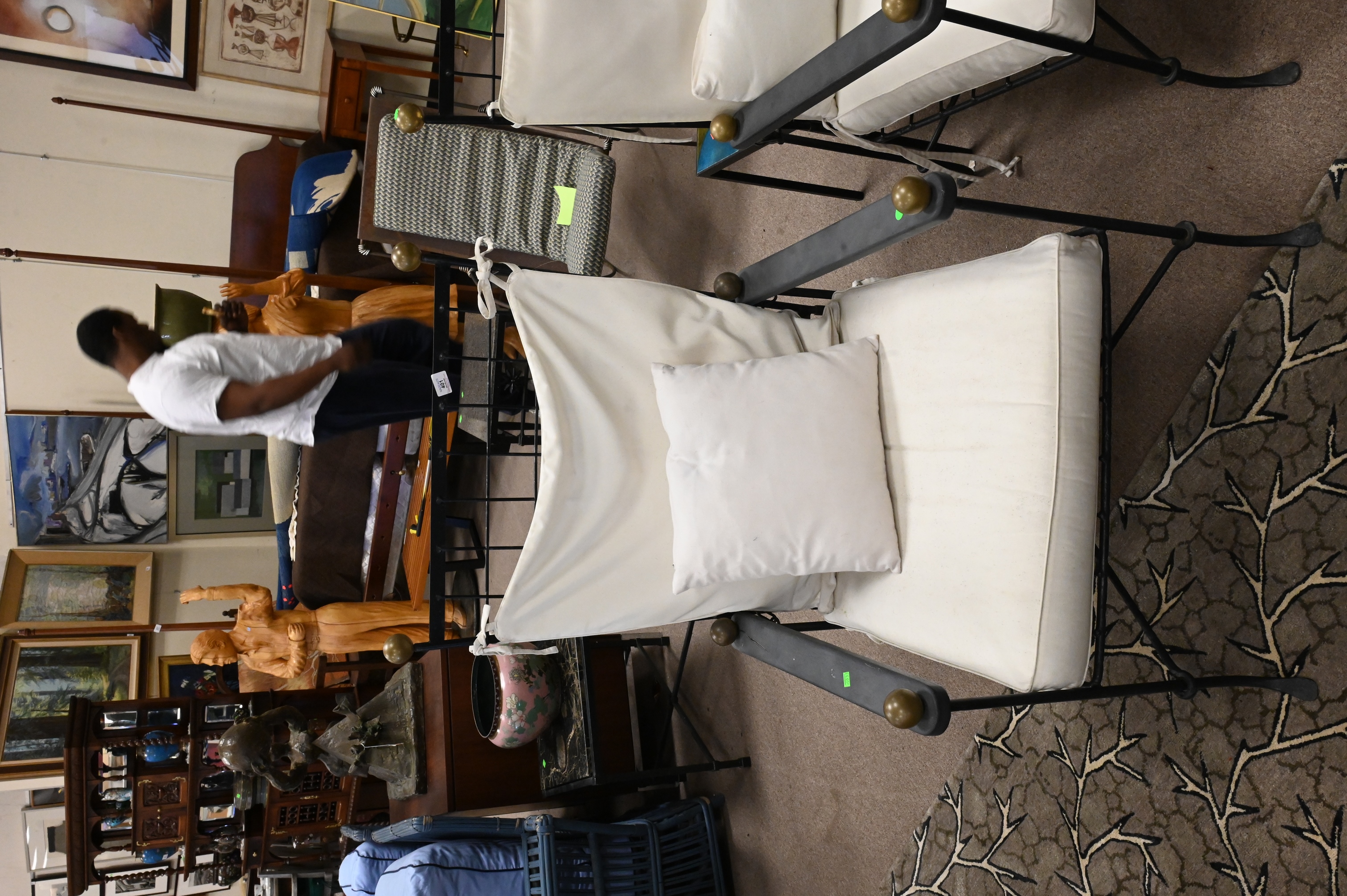wrought iron woven design having brass ball finials and chains for adjustable back along with white cushions