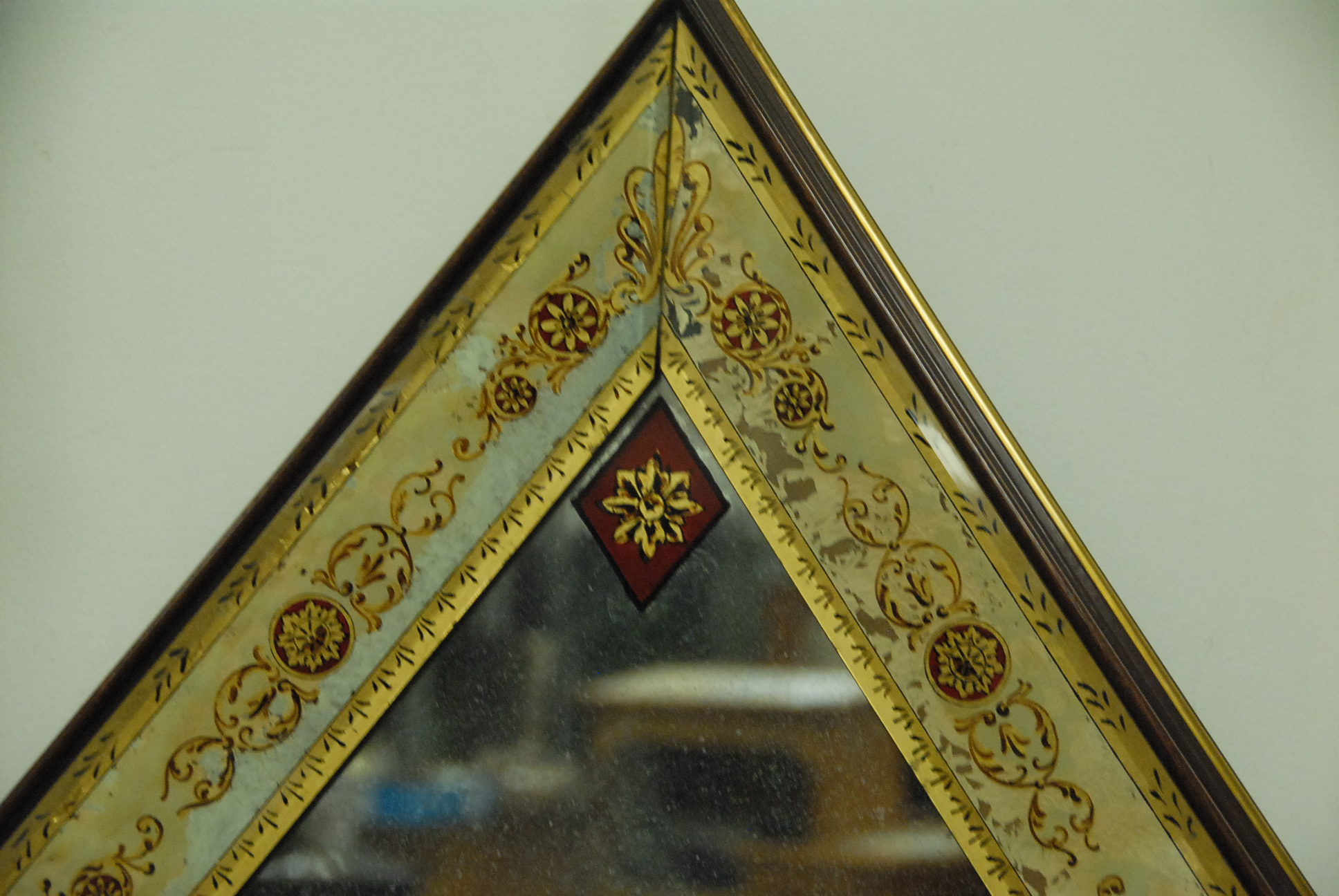 Reverse painted beveled glass wall clock in shape of diamond, ht. 36 1/2.