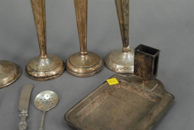 Lot 401: Silver lot to include four sterling silver candlesticks one as is, sterling silver match holder, etc.