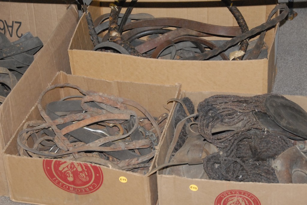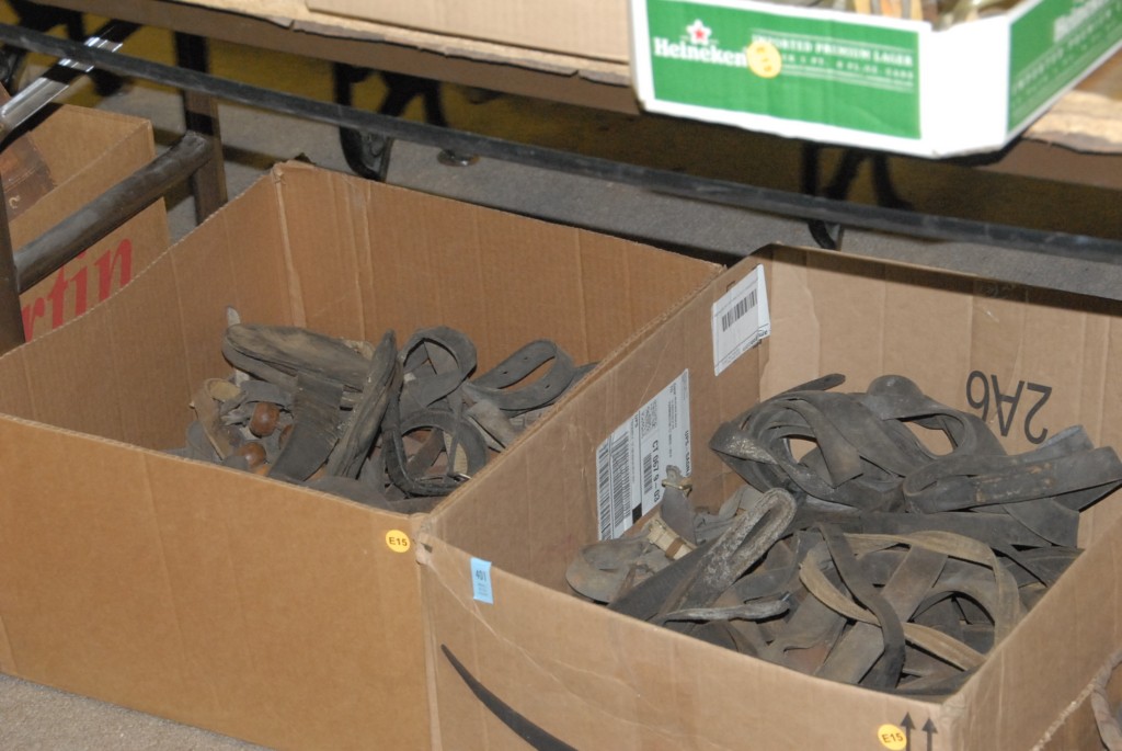 Six boxes of leather straps and leather riding saddle parts and whips.