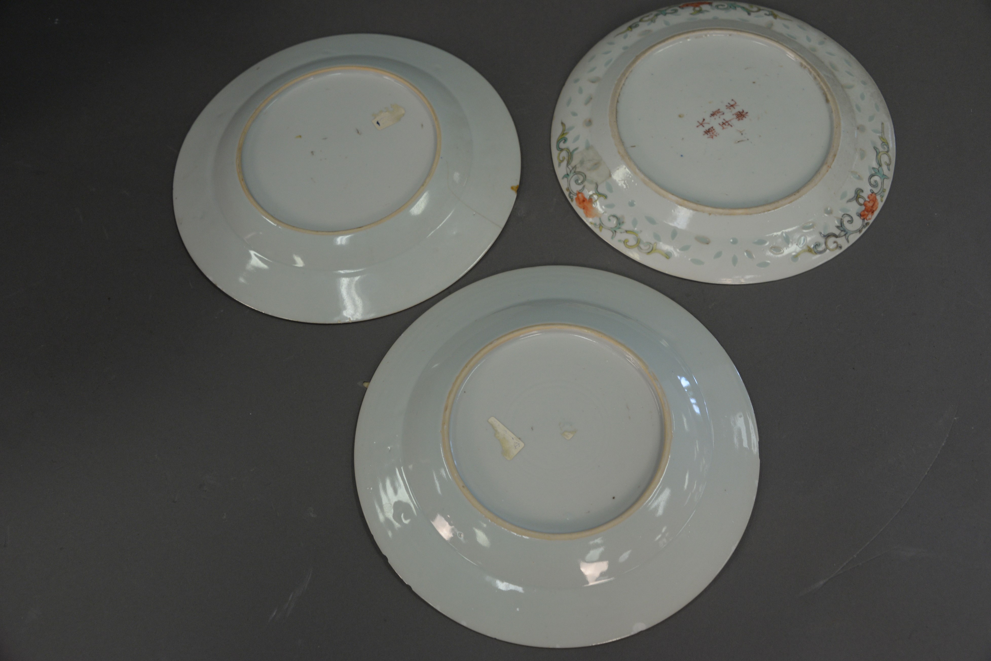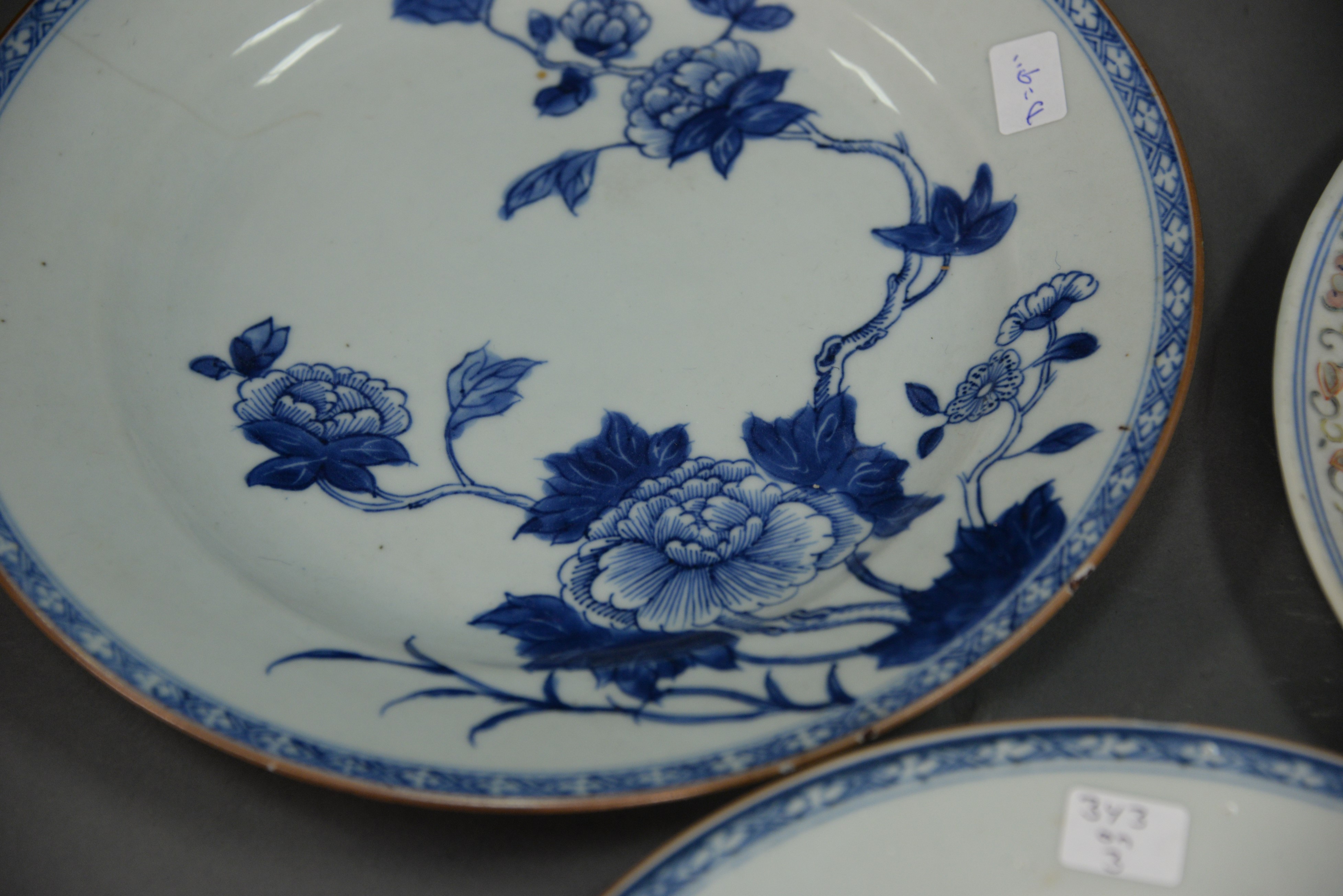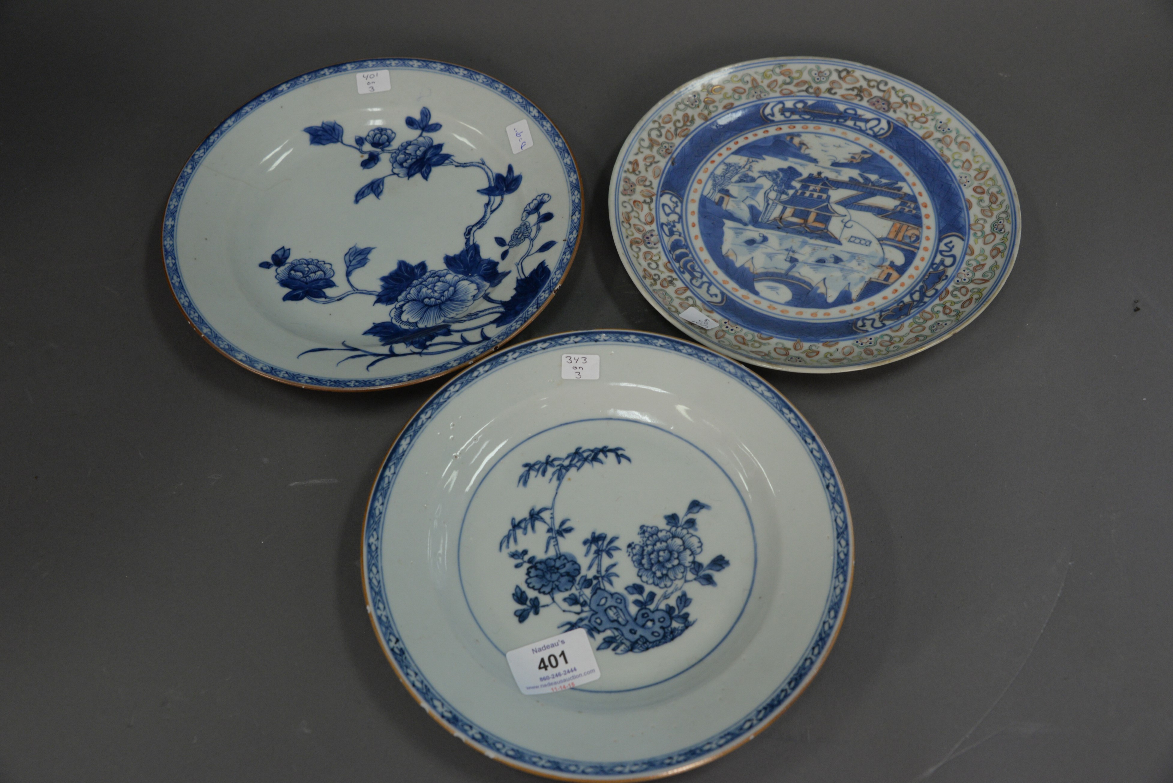 Three export plates including two blue and white chips and crack. dia. 9 in.