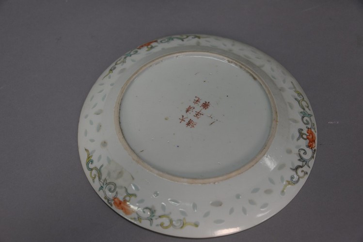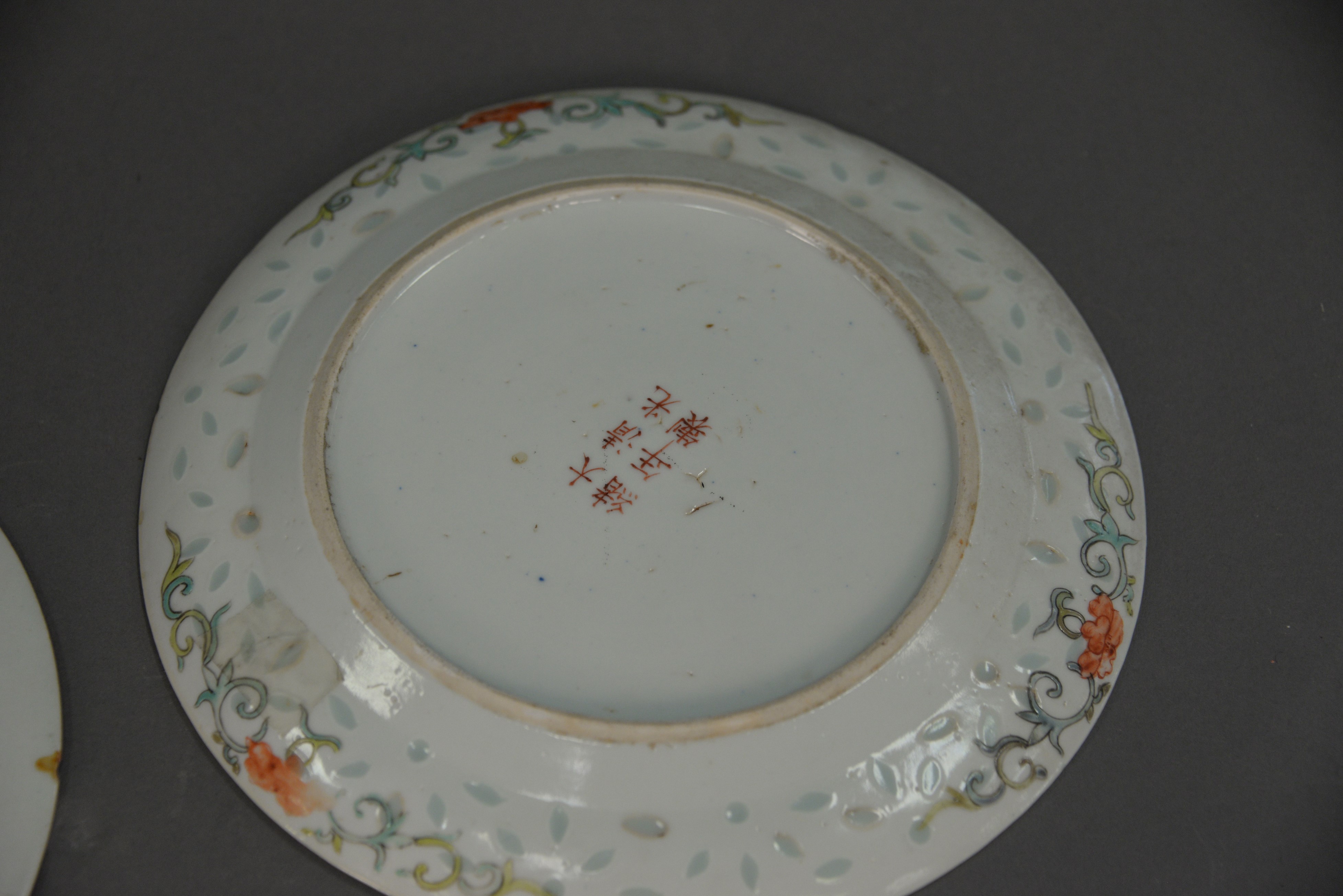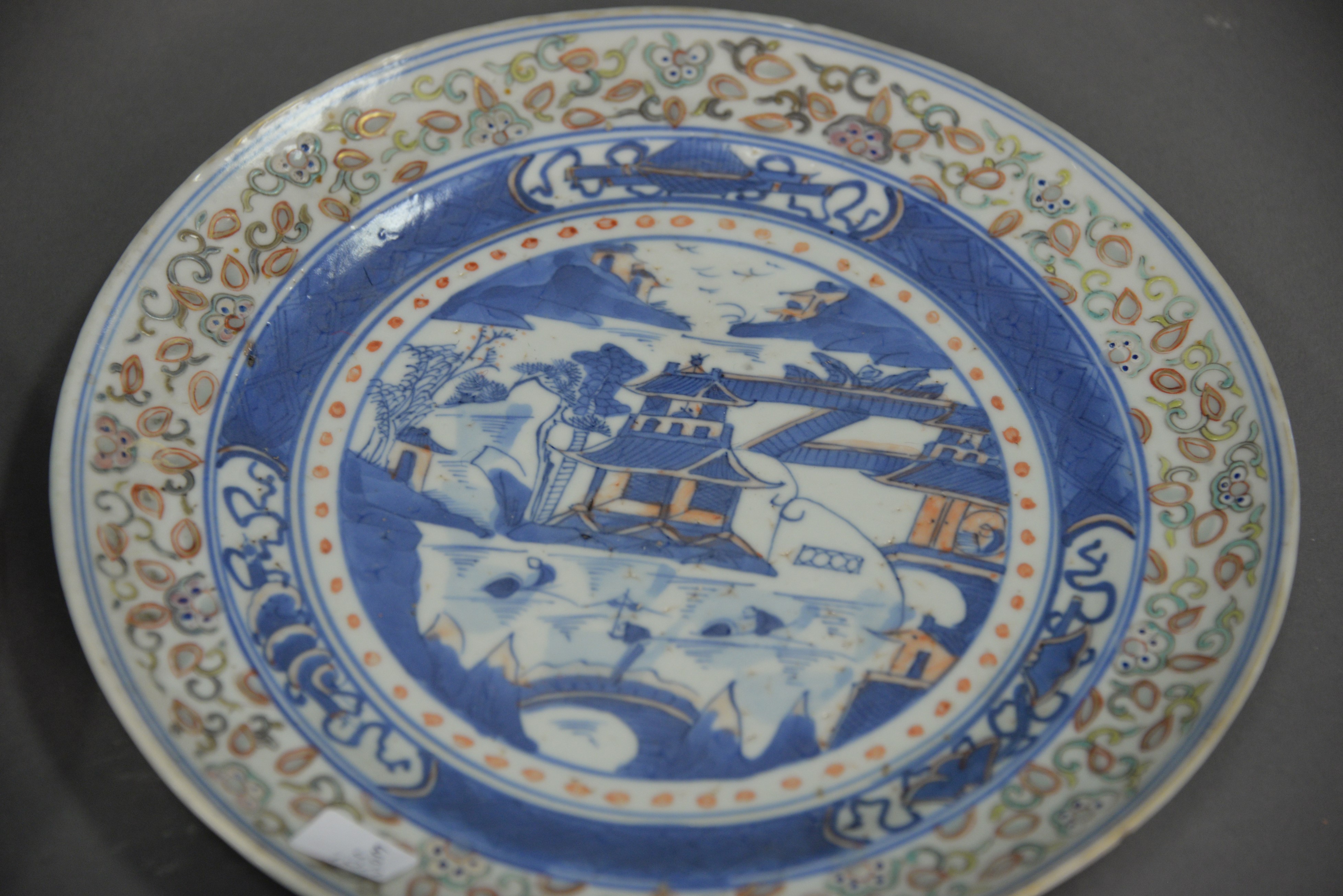 Three export plates including two blue and white chips and crack. dia. 9 in.