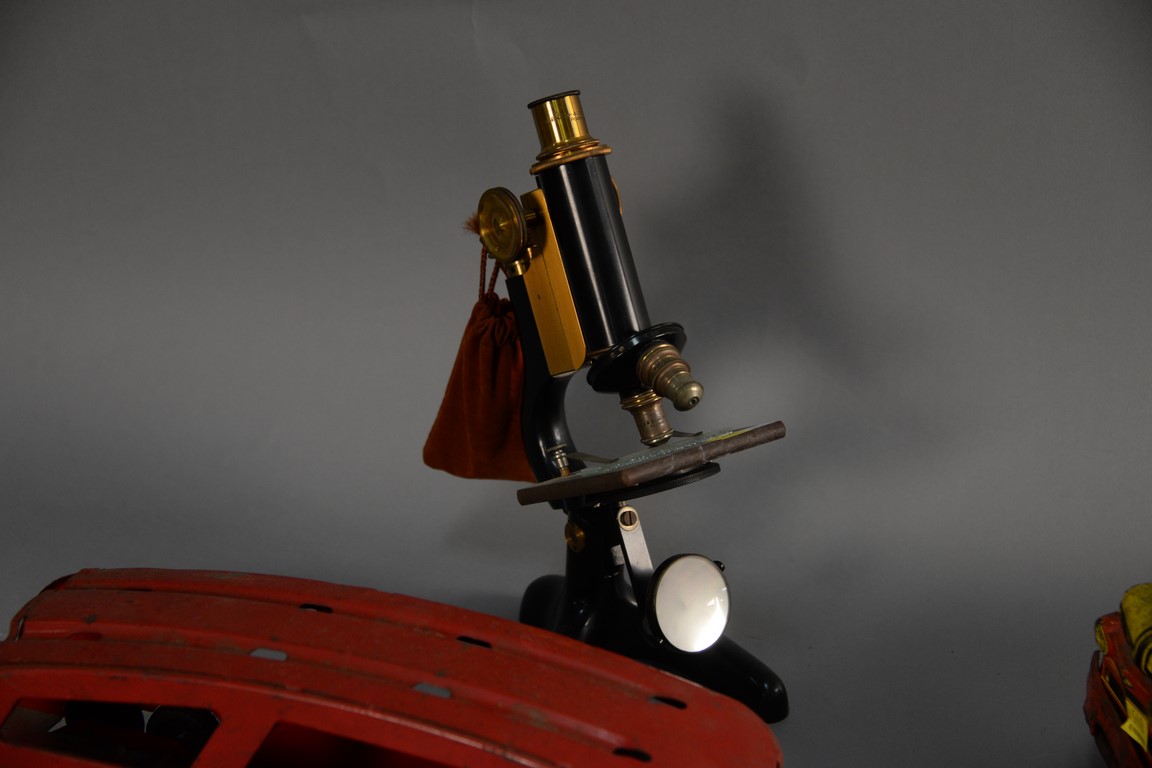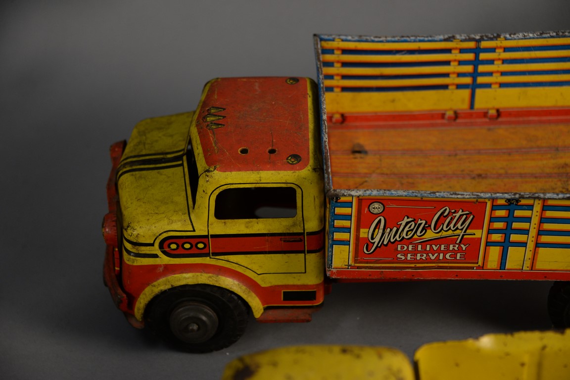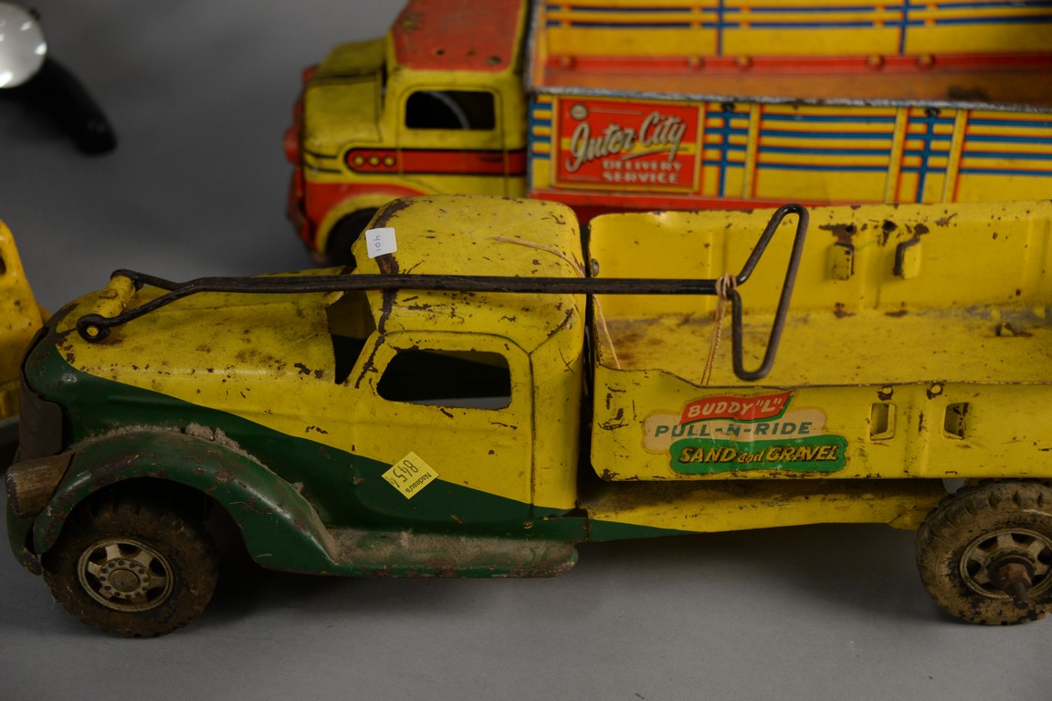 Lot 401: Three vintage toy trucks and a microscope including Buddy L Pull-A-Ride sand and gravel missing seat, Inter-City Delivery Service…