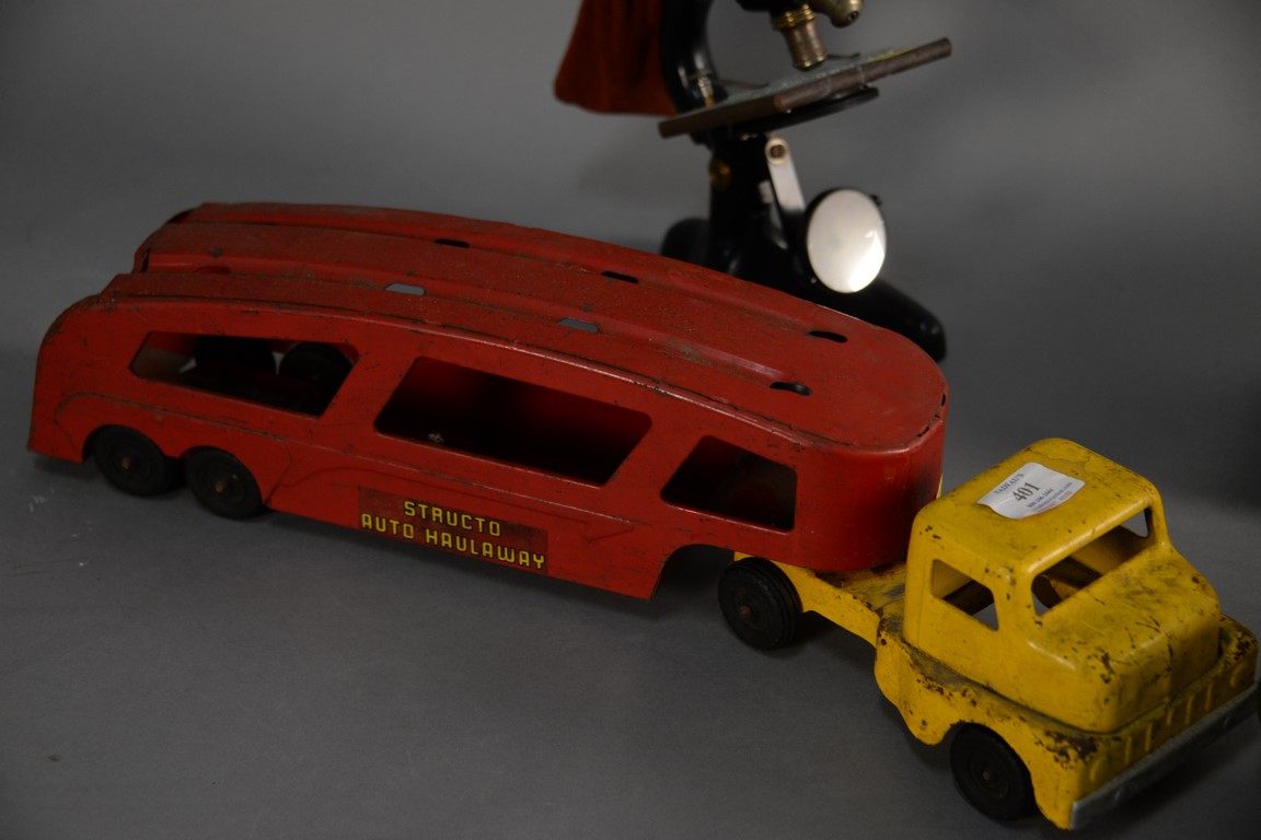 Three vintage toy trucks and a microscope including Buddy L Pull-A-Ride sand and gravel missing seat, Inter-City Delivery Service by Marx, and Structo Auto Haulaway truck.