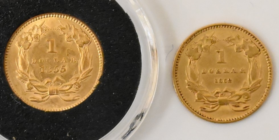 Two Gold Coins, to include 1862 one dollar type 3 AU, 1855 one dollar gold type 2