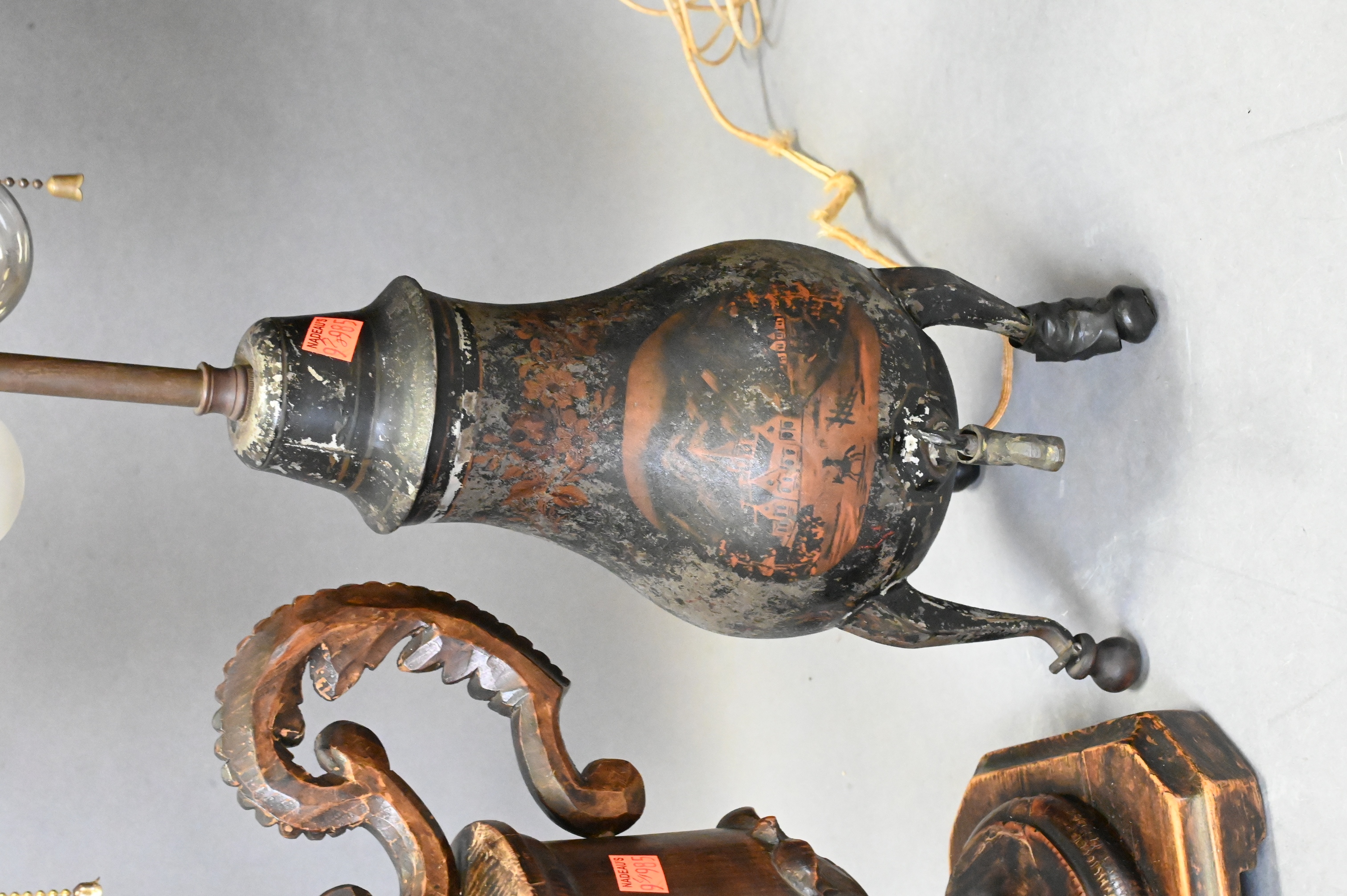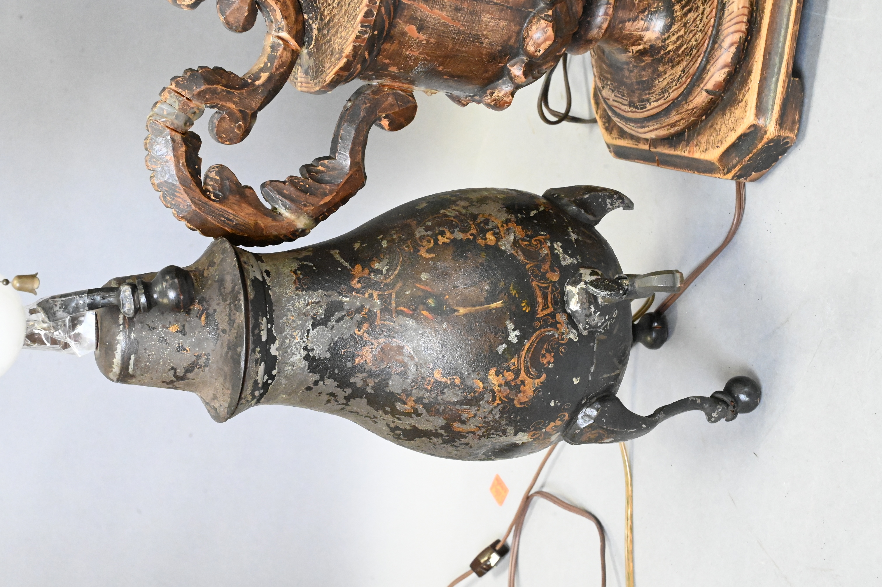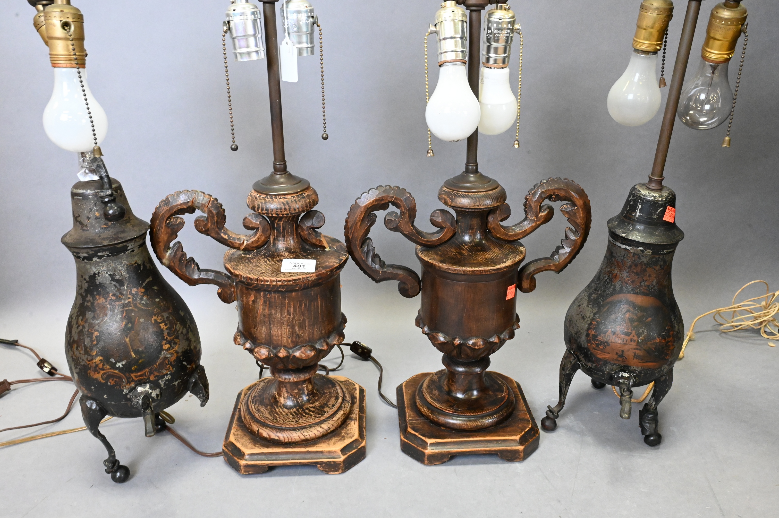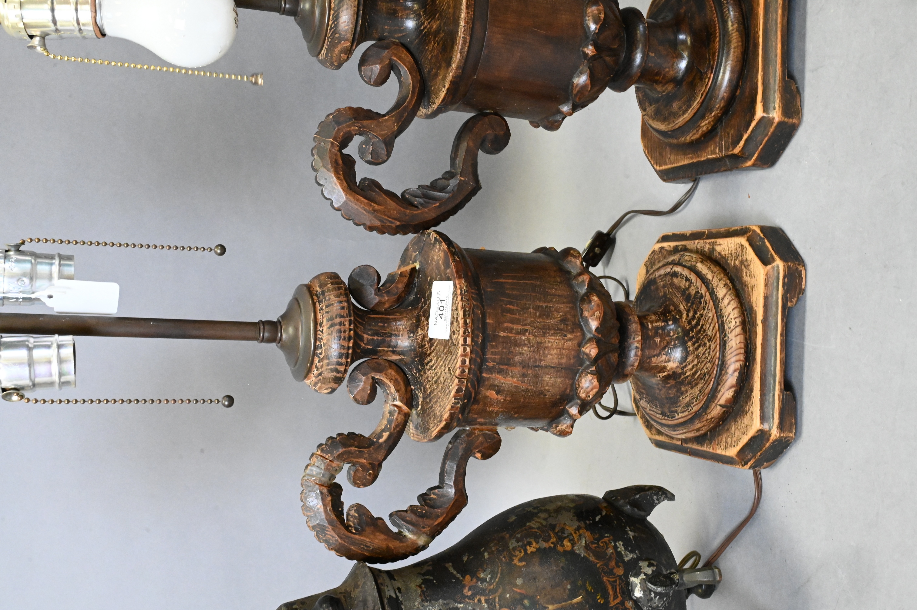 pair of Dutch painted tole tripod water jugs with spigot along with pair of carved wood urn form lamps, one table is missing leg