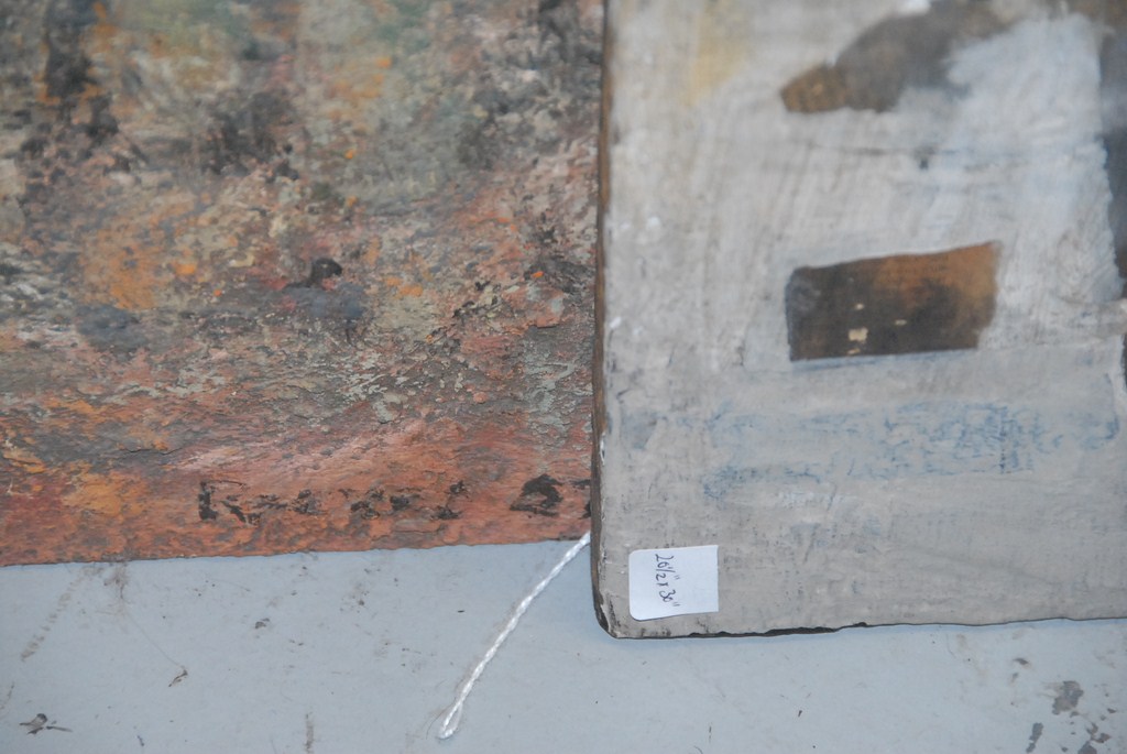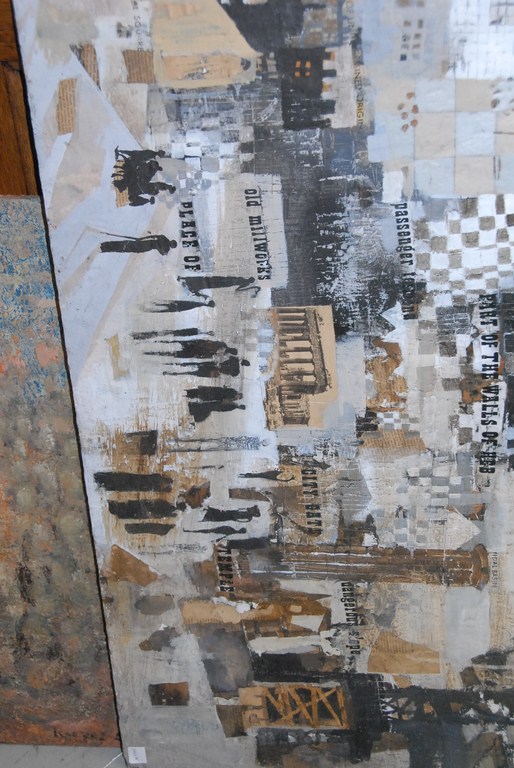 Two unframed pieces to include a collage unsigned – 20 x 30 and an acrylic on board signed lower right indistinctly 67.