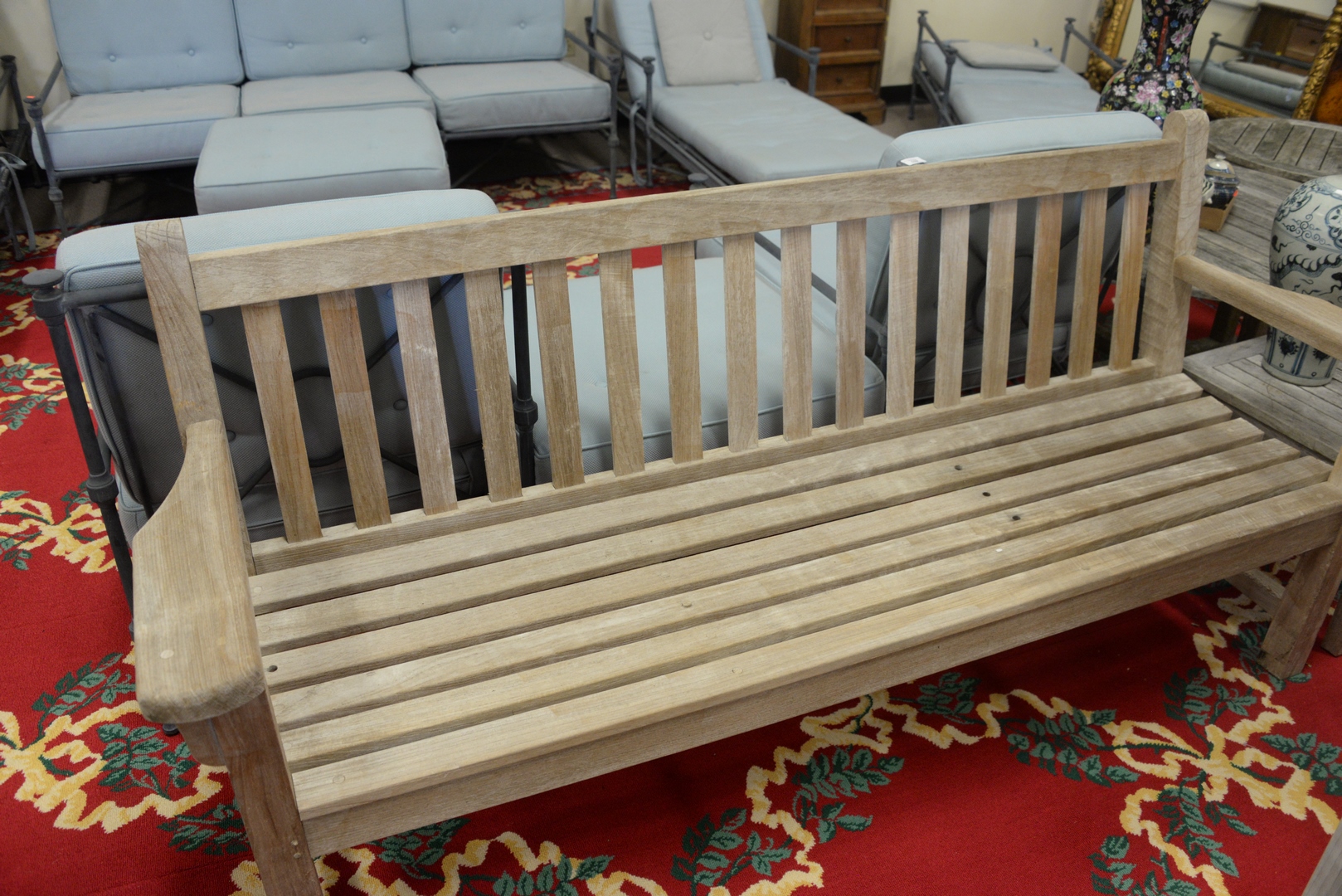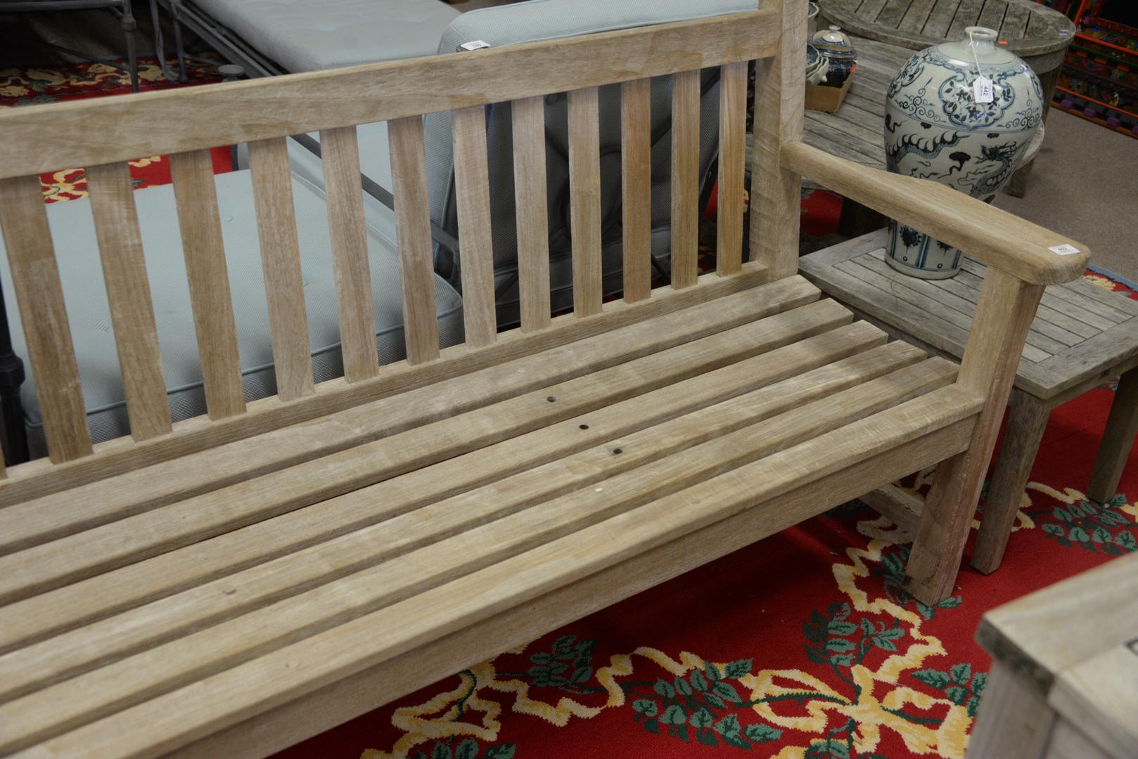 Barlow Tyrie Teak Bench, height 35 inches, length 75 1/2 inches.