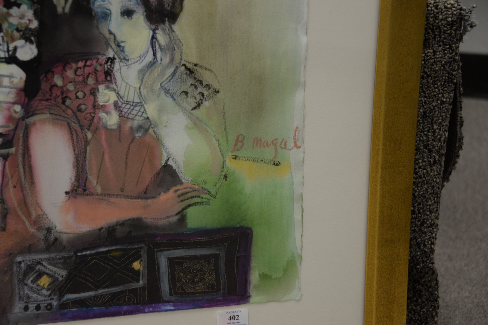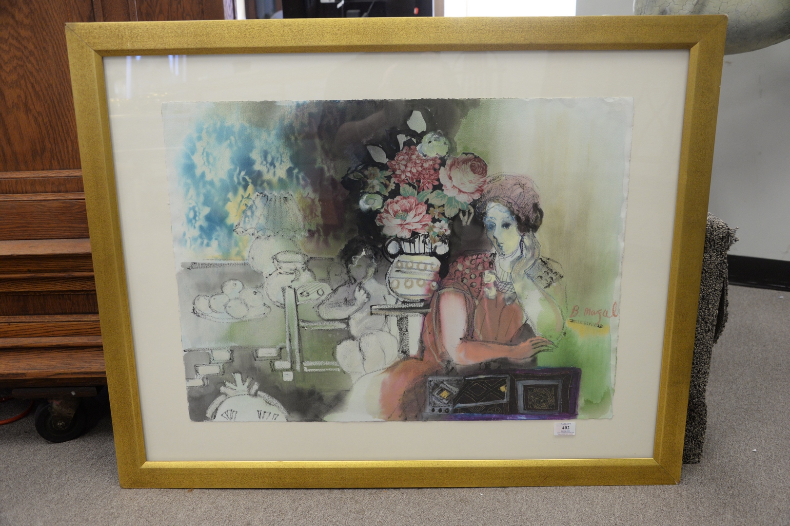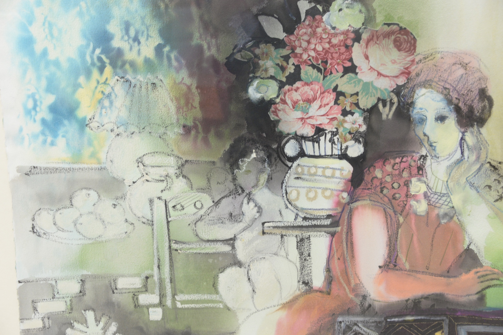 Lot 402: Batia Magal Israeli, b. 1953, interior scene with mother and child, mixed media on paper, signed center right ‘B. Magal’, sheet 22…