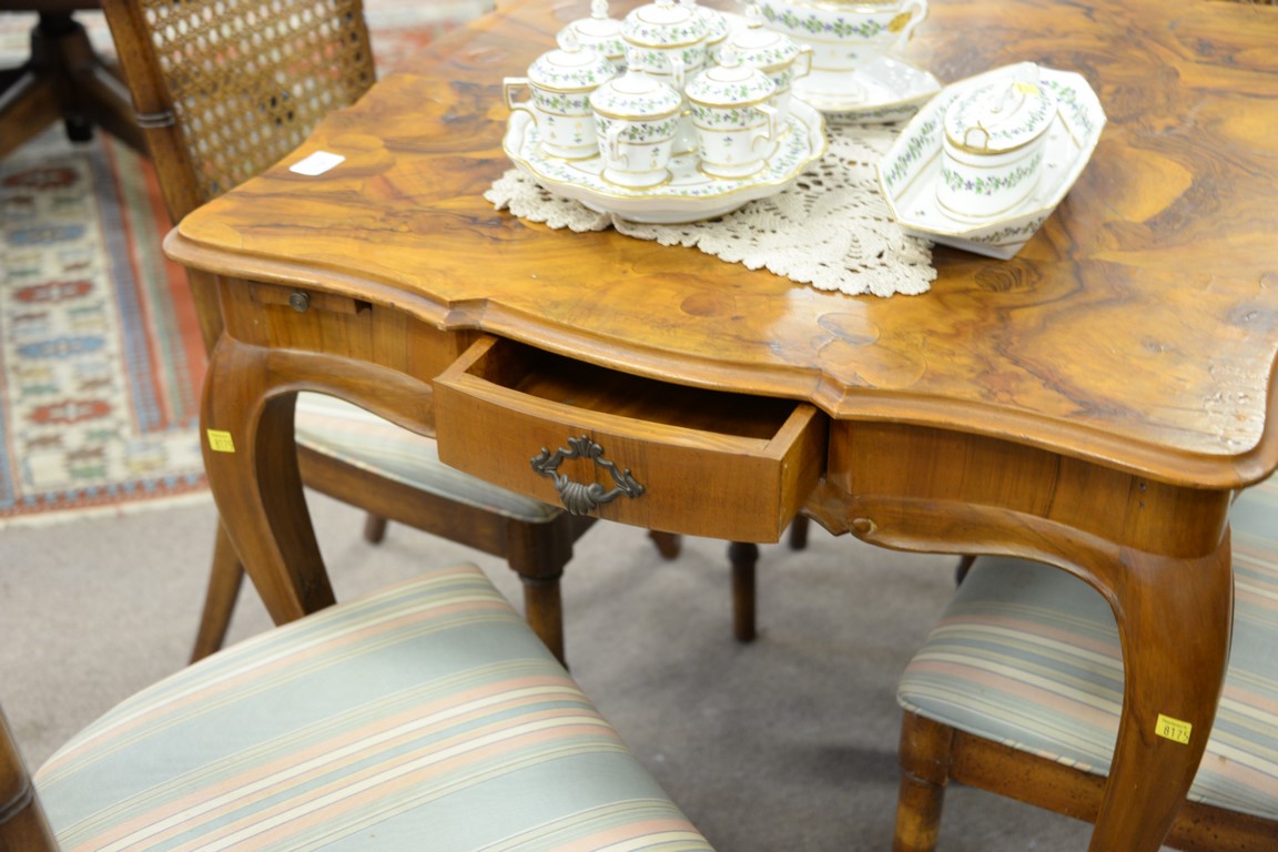 Burlwood five piece games table and chairs. ht. 30in., top: 32 x 32