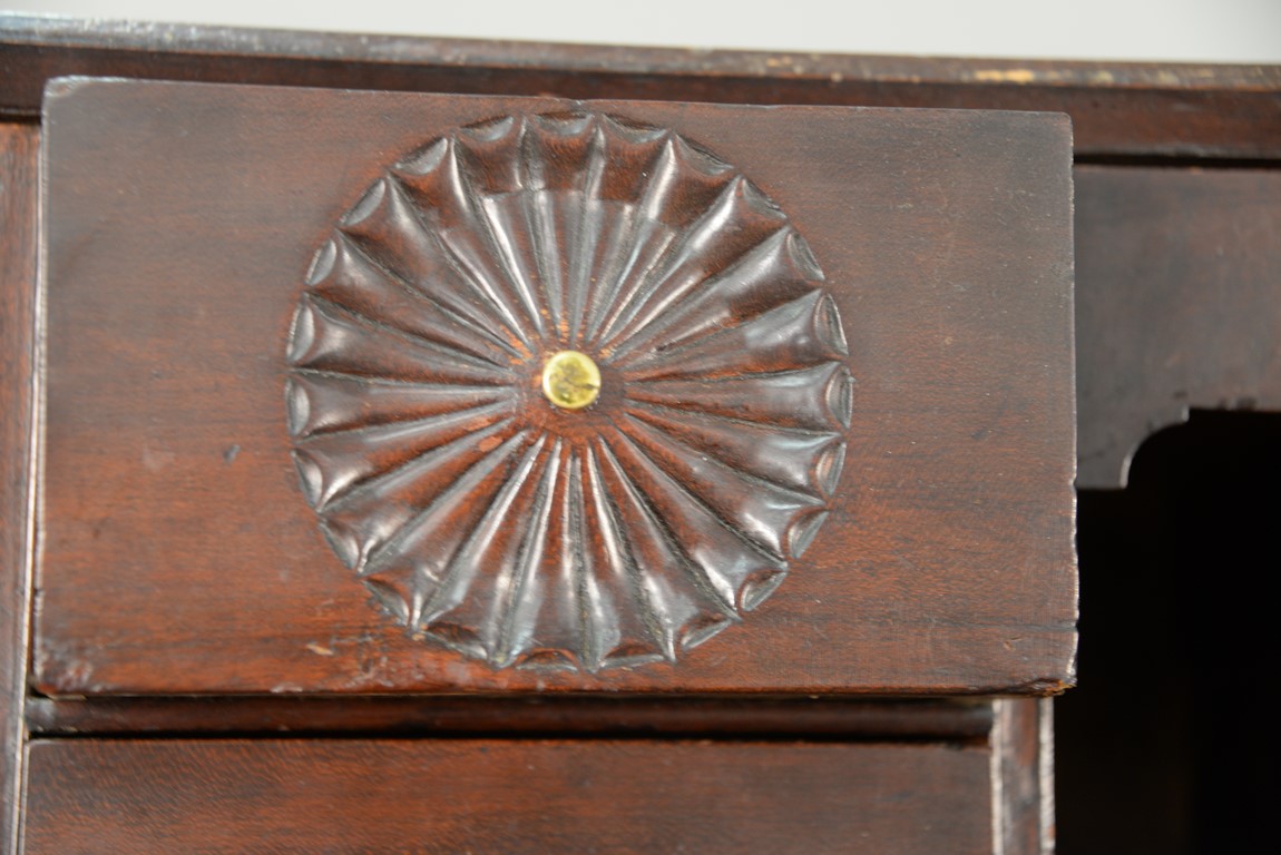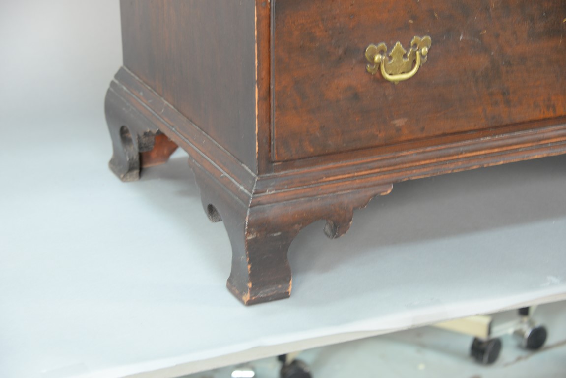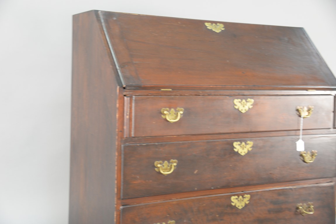 Lot 402: Chippendale cherry desk having slant lid over three graduated drawers on ogee feet, interior with two central drawers, one with pinwheel carving flanked by two top drawers over five drawers. ht. 41 in. case wd. 40 in. dp. 19 in.