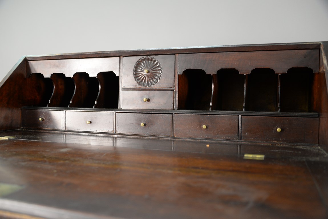 Chippendale cherry desk having slant lid over three graduated drawers on ogee feet, interior with two central drawers, one with pinwheel carving flanked by two top drawers over five drawers. ht. 41 in. case wd. 40 in. dp. 19 in.