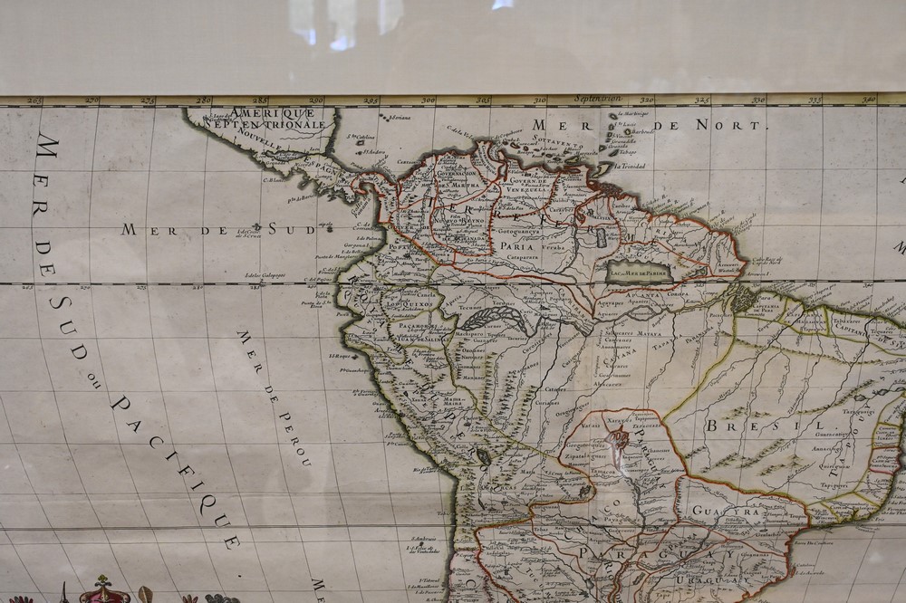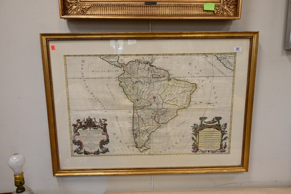 Lot 402: Hubert Jaillot (French, 1632 – 1712), map of South America, “Amerique Meridionale Divisee en ses Principales”, 1642, engraving with hand coloring on paper, sight size 21 3/4 x 34 1/2 inches.