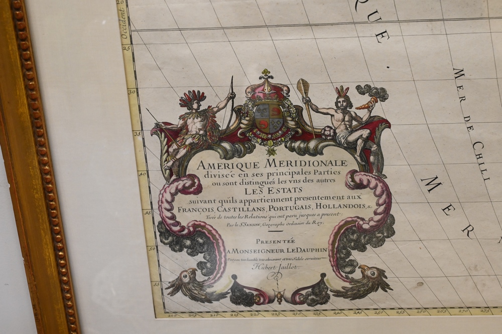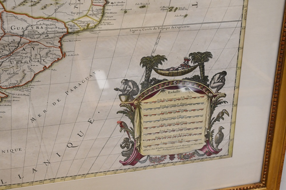 Hubert Jaillot (French, 1632 – 1712), map of South America, “Amerique Meridionale Divisee en ses Principales”, 1642, engraving with hand coloring on paper, sight size 21 3/4 x 34 1/2 inches.